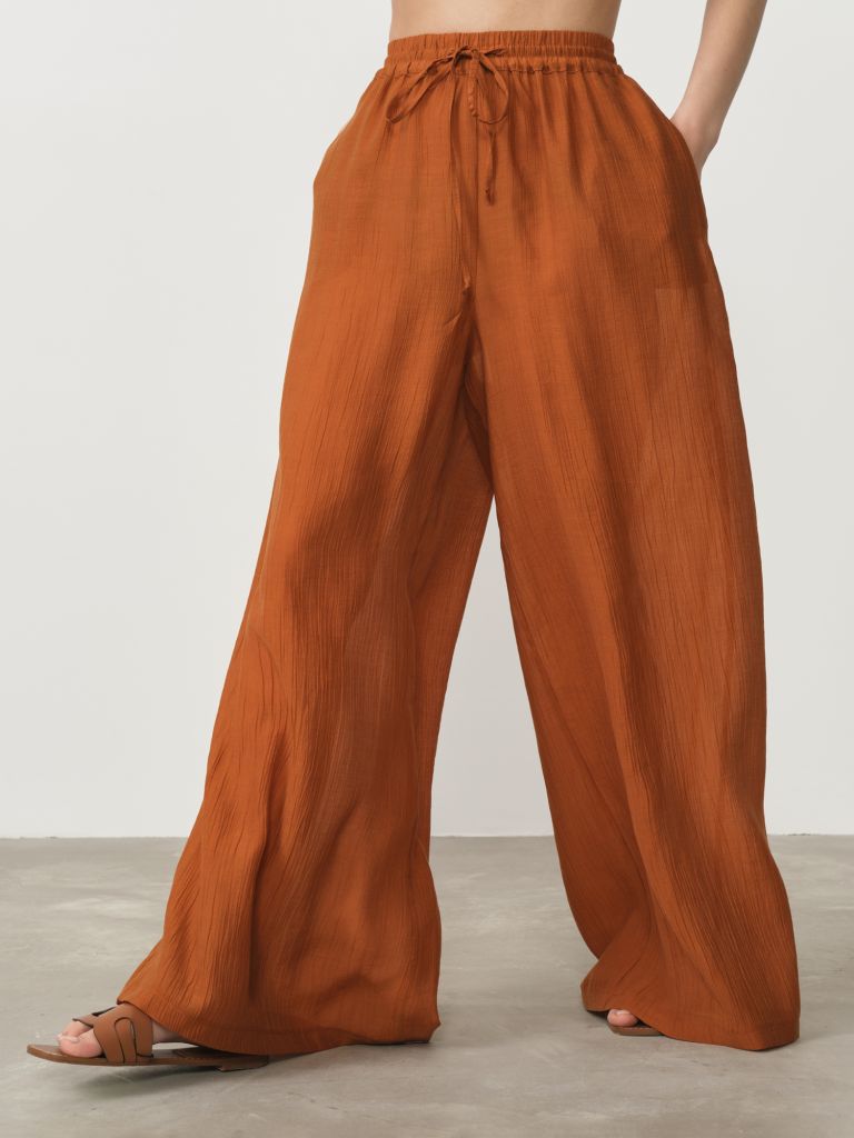 Брюки из лиоцелла терракотового оттенка — это гармония экологичности и современного стиля. Созданные из инновационного материала лиоцелл, полученного из древесной целлюлозы, они сочетают в себе преимущества натуральных тканей с передовыми технологиями производства. Терракотовый цвет с теплым рыже-коричневым подтоном напоминает оттенки заката, добавляя образу глубину и природную элегантность.Мягкая, струящаяся ткань приятно облегает фигуру, создавая женственный силуэт без стеснения движений. Лиоцелл обладает исключительной воздухопроницаемостью и гигроскопичностью, обеспечивая комфорт даже в жаркую погоду. Эти брюки легко сочетаются с бежевыми, кремовыми или белыми топами, создавая гармоничные летние ансамбли, или с темными рубашками для более контрастных образов.Экологичность лиоцелла делает эту модель ответственным выбором — производство требует меньше воды и энергии по сравнению с хлопком. Ткань устойчива к сминанию и сохраняет насыщенный цвет после множества стирок. Выберите эти брюки — пусть их теплый терракотовый оттенок и непревзойденный комфорт вдохновят вас на создание стильных образов с заботой о природе.Размерная сетка