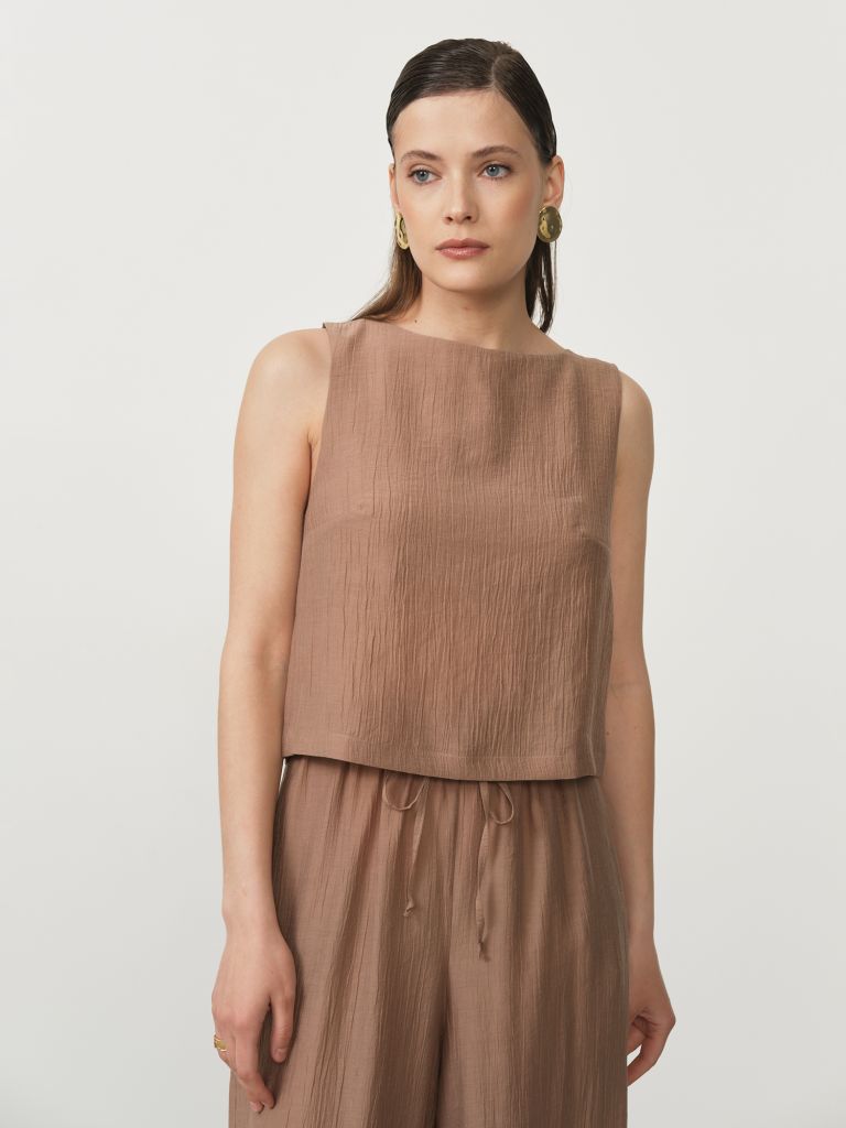Элегантный женский топ из экологичного лиоцелла в благородном оттенке какао – идеальное сочетание природной эстетики и современного комфорта. Этот инновационный материал, получаемый из древесной целлюлозы эвкалипта, отличается мягкостью шелка и легкостью хлопка, создавая невероятно приятные тактильные ощущения. Лиоцелл обладает естественным благородным блеском и превосходной драпируемостью, придающей изделию изысканный вид.Модель имеет свободный крой, обеспечивающий непринужденную элегантность и свободу движений в течение всего дня. Теплый оттенок какао создает универсальную основу для различных комбинаций – топ одинаково гармонично сочетается с белыми, бежевыми, терракотовыми и другими земляными оттенками, а также эффектно контрастирует с более яркими цветами.Лиоцелл обладает исключительными гигиеническими свойствами, особенно ценными в теплое время года – материал отлично пропускает воздух, эффективно отводит влагу от тела и обладает естественным антибактериальным эффектом. Ткань гипоаллергенна, не вызывает раздражения даже на чувствительной коже и с каждой стиркой становится только мягче.Этот универсальный топ станет ключевым элементом базового гардероба, идеально подходящим для создания как повседневных, так и более нарядных образов. Дополните его брюками из той же коллекции для создания элегантного комплекта или носите с джинсами и юбками для более свободных повседневных ансамблей.