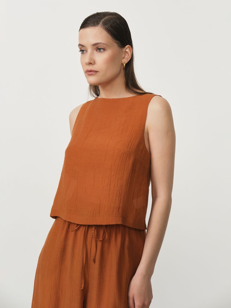 Стильный женский топ из экологичного лиоцелла в глубоком терракотовом оттенке – идеальное сочетание современного дизайна и заботы о планете. Этот инновационный материал, получаемый из древесной целлюлозы эвкалипта, отличается шелковистой текстурой, легкостью и прекрасной драпируемостью, подчеркивающей естественность силуэта. Лиоцелл сочетает в себе лучшие качества натуральных тканей с улучшенной прочностью и износостойкостью.Модель имеет свободный крой, обеспечивающий непринужденную элегантность и комфорт в течение всего дня. Особенность этого топа – его универсальность: он прекрасно работает как самостоятельно в жаркую погоду, так и в многослойных образах в прохладные дни. Насыщенный терракотовый цвет добавляет образу глубину и теплоту, выгодно подчеркивая любой оттенок кожи.Лиоцелл обладает превосходными гигиеническими свойствами – отлично пропускает воздух, эффективно отводит влагу и обладает естественной антибактериальной защитой, что особенно ценно в теплое время года. Материал не вызывает раздражения даже на чувствительной коже и становится мягче с каждой стиркой, сохраняя при этом форму и цвет.Этот топ станет великолепной основой для создания разнообразных образов – от повседневных с джинсами или шортами до более элегантных с юбками или брюками из той же коллекции. Дополните свой гардероб этим экологичным и стильным предметом одежды, который будет радовать вас своим комфортом и современным дизайном.
