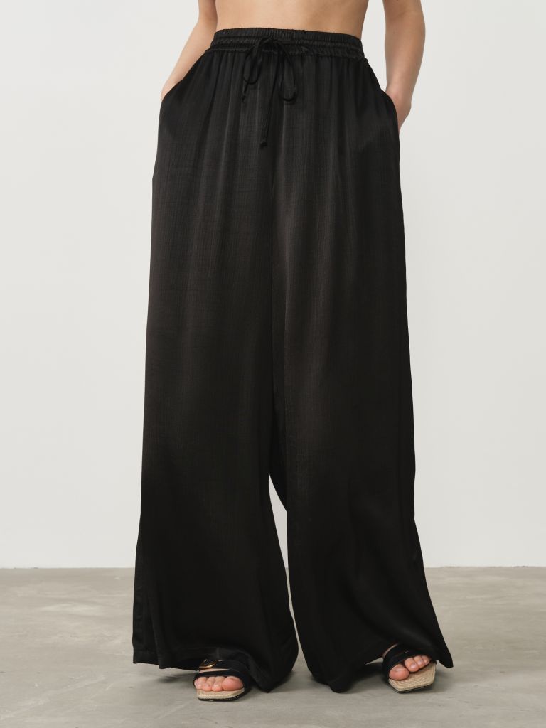 Утонченные женские брюки из 100% натуральной вискозы в глубоком черном цвете – незаменимая основа элегантного гардероба для любого сезона. Этот премиальный экологичный материал, получаемый из переработанной древесной целлюлозы, обладает благородным легким блеском и исключительно приятной текстурой, что делает брюки одновременно роскошными и комфортными в носке. Вискоза создает эффект мягкого облегания без ощущения сжатости, позволяя коже дышать и сохраняя комфортную температуру.Модель имеет продуманный свободный крой, который идеально драпируется, формируя плавные линии и подчеркивая женственность силуэта. Удобный эластичный пояс с элегантными завязками обеспечивает комфортную посадку и возможность регулировать объем, адаптируя его под индивидуальные особенности фигуры. Глубокий черный цвет придает брюкам особую универсальность – они органично вписываются в любой образ, от делового до вечернего, служа идеальным фоном как для сдержанных, так и для ярких верхних частей ансамбля.Вискозное полотно обладает повышенной износостойкостью, сохраняет форму и не образует катышки после многократных стирок. Эти элегантные черные брюки – универсальный базовый элемент, который прослужит не один сезон, сохраняя безупречный внешний вид и комфорт при носке.Эти изысканные брюки станут базовым элементом вашего гардероба, который легко трансформируется из делового в вечерний наряд с помощью правильно подобранных аксессуаров.Размерная сетка