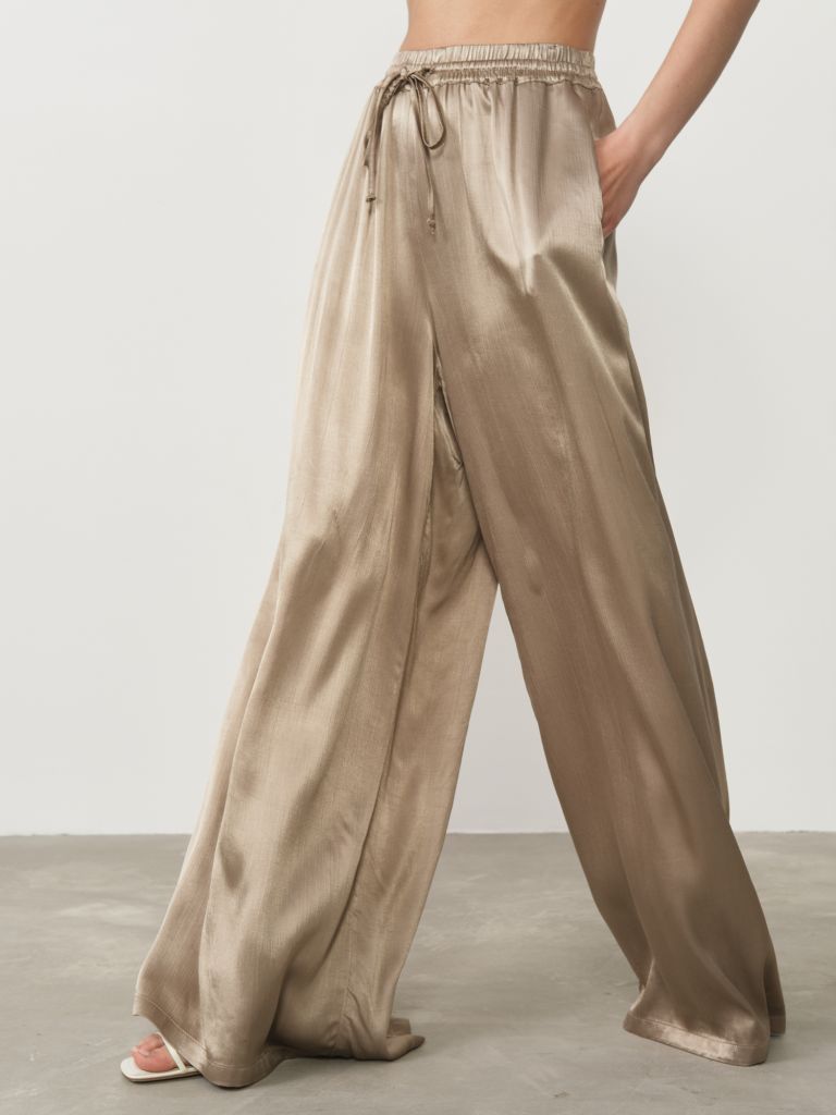 Элегантные женские брюки из 100% натуральной вискозы в благородном бежевом оттенке – идеальное решение для создания утонченных образов в любое время года. Этот премиальный материал, полученный из древесной целлюлозы, обладает шелковистой текстурой и лёгким благородным блеском, что придаёт изделию роскошный вид при сохранении абсолютного комфорта. Вискоза отличается превосходной воздухопроницаемостью и способностью отводить влагу, благодаря чему брюки остаются комфортными даже в теплую погоду.Свободный крой с мягкими линиями создает актуальный расслабленный силуэт, который элегантно драпируется и обеспечивает свободу движений. Удобный эластичный пояс с декоративными завязками позволяет регулировать посадку и добавляет стильный акцент. Универсальный бежевый оттенок делает эти брюки исключительно многогранными в плане сочетаемости – они одинаково гармонично смотрятся как с деловыми блузами и жакетами, так и с повседневными топами и футболками.Натуральная вискоза превосходно драпируется, формируя мягкие струящиеся линии, которые льстят фигуре и создают женственный силуэт. Материал устойчив к деформации и сохраняет безупречный вид на протяжении всего дня, не мнётся и не теряет форму. Эти изысканные брюки станут базовым элементом вашего гардероба, который легко трансформируется из делового в вечерний наряд с помощью правильно подобранных аксессуаров.Размерная сетка