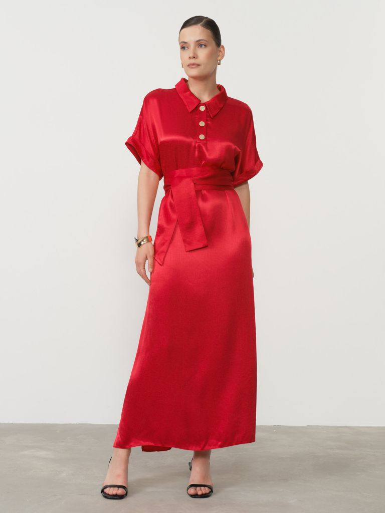 Яркое платье из натуральной вискозы в насыщенном красном цвете – эффектное решение для женщин, желающих произвести незабываемое впечатление. Изготовленное из 100% вискозы премиального качества, это платье обладает шелковистой текстурой и невероятной легкостью, обеспечивая комфорт и элегантный вид в любой ситуации. Особую изысканность модели придает воротник-стойка с декоративными пуговицами, создающий стильный акцент и подчеркивающий линию шеи.Натуральная вискоза – экологичный материал с выдающимися гигиеническими свойствами: она великолепно пропускает воздух, отводит влагу и не вызывает раздражения даже при длительной носке. Платье имеет продуманный свободный крой, который элегантно обыгрывает фигуру, а пояс на талии создает женственный силуэт, подчеркивая достоинства фигуры.Насыщенный красный цвет добавляет образу страсти и энергии, привлекая восхищенные взгляды окружающих. Это идеальный выбор для особых случаев, романтических встреч или когда просто хочется выглядеть неотразимо. Платье легко сочетается как с классическими лодочками для создания элегантного вечернего образа, так и с более casual обувью для повседневных выходов.Подарите себе яркие эмоции вместе с этим роскошным платьем, которое подчеркнет вашу индивидуальность и станет любимым предметом гардероба на долгое время!