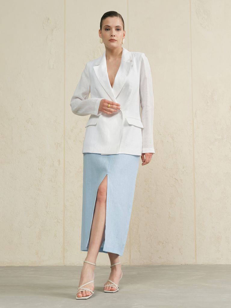 Льняная юбка миди небесно-голубого цвета — это стильное и практичное решение для вашего летнего гардероба. Изготовленная из натурального льна, эта юбка подарит вам комфорт и прохладу даже в самые жаркие дни. Актуальный разрез спереди добавляет образу динамичности и женственности, делая вашу походку легкой и уверенной. Небесно-голубой оттенок прекрасно освежает образ, подчеркивая легкость и воздушность стиля. Модель оснащена удобной застежкой на пуговице и карманами, что делает юбку не только красивой, но и функциональной. Свободный крой не стесняет движений, обеспечивая максимальный комфорт в повседневной носке. Эта юбка станет идеальным выбором для прогулок, работы или встреч с друзьями.Размерная сетка