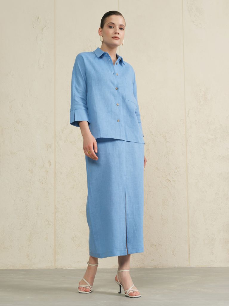 Элегантная льняная юбка миди голубого цвета — это идеальный выбор для летнего гардероба. Выполненная из натурального льна, эта юбка обеспечивает комфорт и приятные ощущения даже в самые жаркие дни. Модель дополнена стильным разрезом спереди, что добавляет образу динамичности и лёгкой сексуальности. Классический голубой цвет делает юбку универсальной, подходящей для множества образов — от повседневного до более нарядного. Застежка на пуговице и аккуратный крой подчеркивают минимализм и изящество изделия. Эта юбка станет отличным выбором как для прогулок по городу, так и для вечерних мероприятий. Свободный крой и разрез обеспечивают максимальную свободу движений, делая юбку не только красивой, но и удобной.