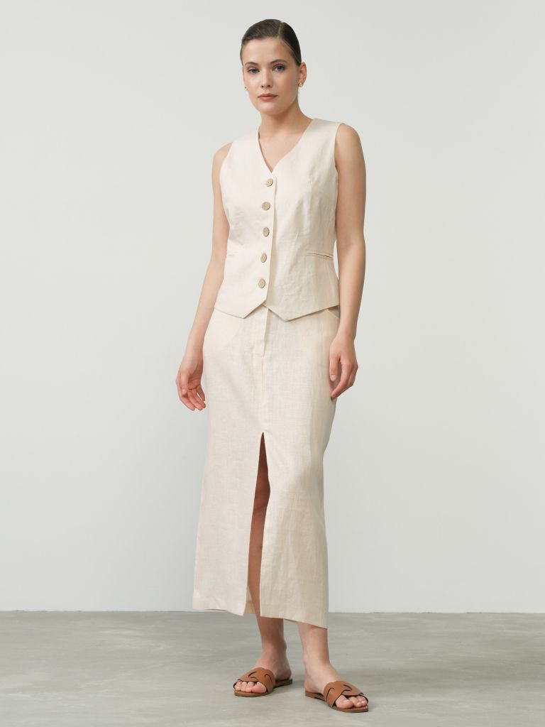 Льняная юбка миди светло-бежевого цвета — это сочетание элегантности и комфорта, идеально подходящее для летнего сезона. Юбка выполнена из натурального льна, что обеспечивает приятные ощущения на коже и легкость в носке даже в самые жаркие дни. Модель имеет актуальный разрез спереди, придающий образу женственность и немного дерзости. Светло-бежевый оттенок делает юбку универсальной для различных комбинаций с другими элементами гардероба. Стильный крой с застежкой на пуговице подчеркивает талию, создавая гармоничный силуэт. Эта юбка прекрасно подходит как для повседневных прогулок, так и для более официальных мероприятий, добавляя в ваш образ нотку изысканности.