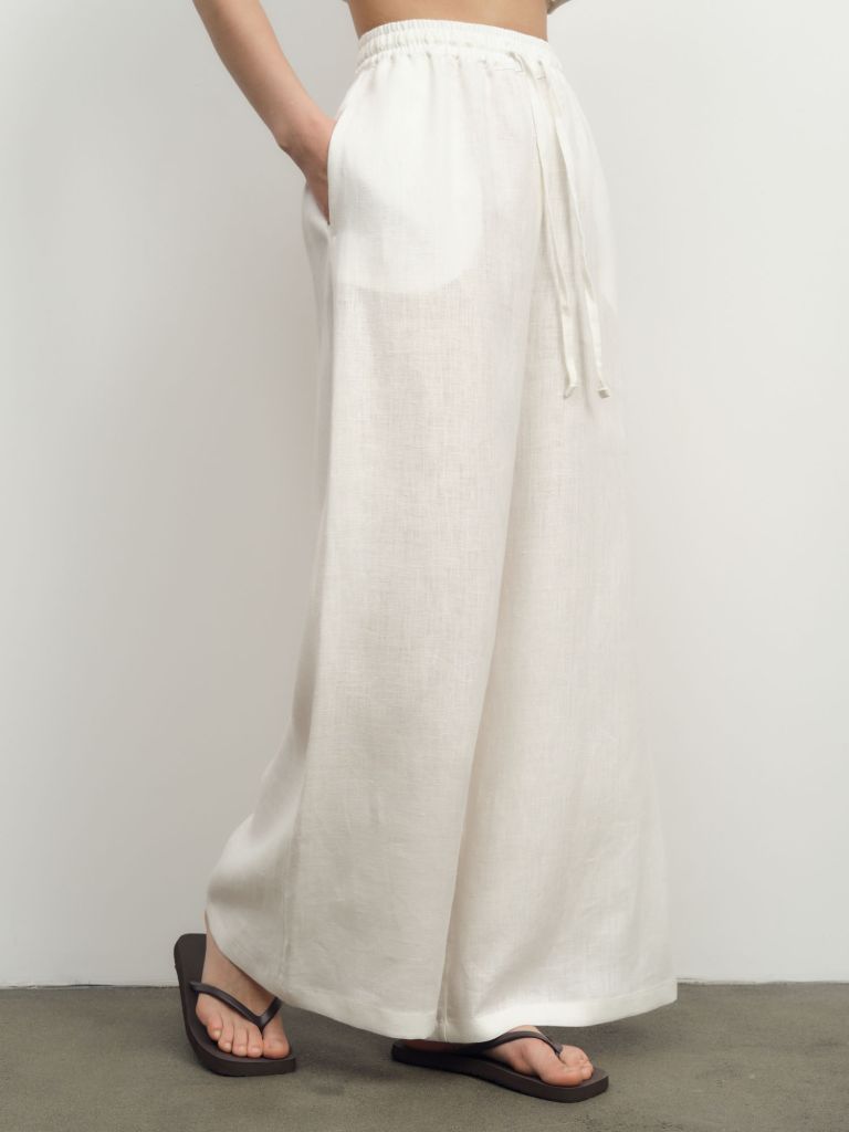 Брюки льняные белые – свежесть и элегантностьКлассические белые льняные брюки свободного кроя – универсальная основа для стильных летних образов. Натуральный материал обеспечивает комфорт, а лаконичный дизайн делает их идеальными для офиса, прогулок и отдыха.5 причин купить:УниверсальностьТерморегуляцияСтройнящий эффектПрочностьЭкологичностьБазовые сочетания:• С синей шелковой блузой и лодочками• К черному топу и сандалиям на плоской подошве• С полосатой тельняшкой для морского стиляБелые льняные брюки – ваша основа безупречного летнего стиля!