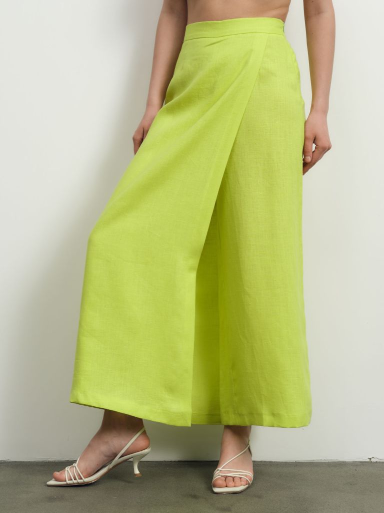 Юбка-брюки льняные цвета лайм – свежесть и комфорт в каждом движенииПочему стоит выбрать:• Натуральный лён обеспечивает идеальную воздухопроницаемость• Свободный крой не сковывает движений• Яркий цвет заряжает позитивом и привлекает внимание• Универсальность: легко комбинируется с базовыми вещамиС чем носить:С белой хлопковой рубашкой или топомВ паре с джинсовой курткойС плетёными аксессуарами и сандалиямиС массивными деревянными украшениямиОсвежите свой гардероб этим сочным акцентом – почувствуйте лёгкость настоящего лета!