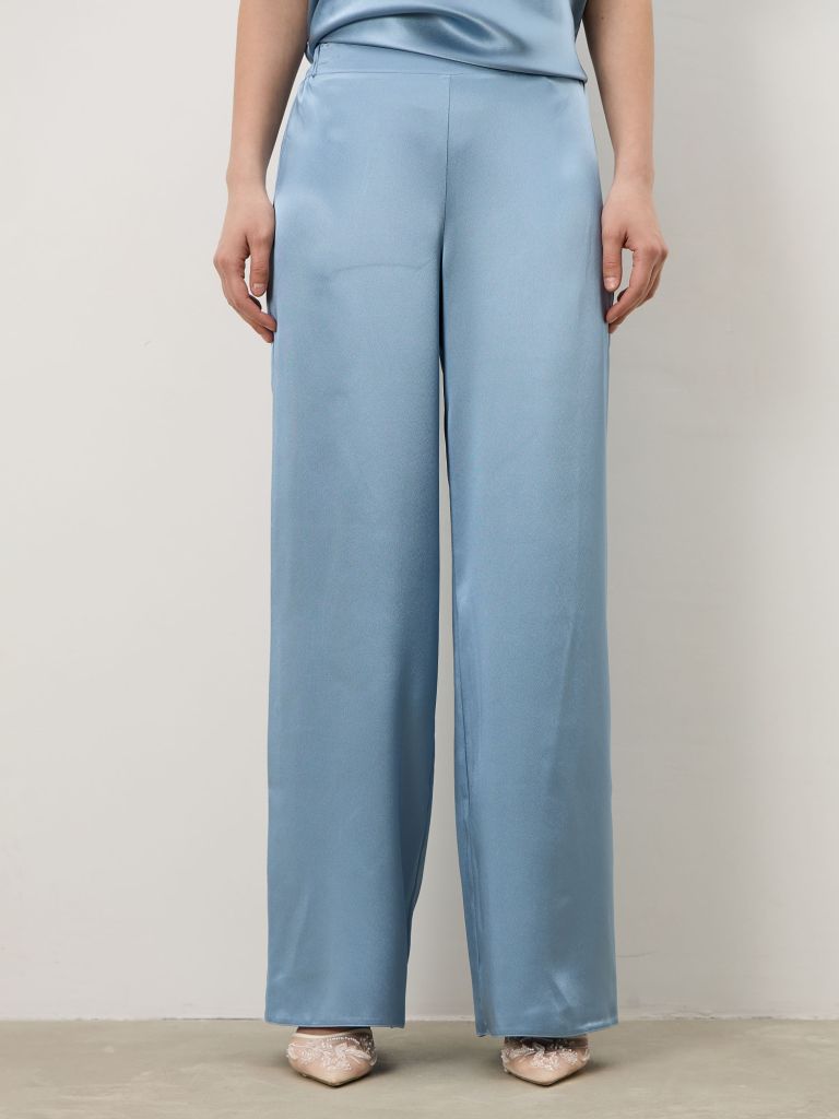 Голубые брюки из района 50119 — это ощущение воздуха и спокойствия в движении. Они мягко струятся по фигуре, не сковывают шаг и создают лёгкий, собранный силуэт. Такой цвет работает как тихий акцент: освежает образ и добавляет ему глубины без лишней яркости.