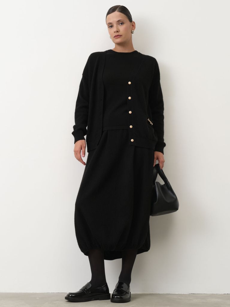 Стильная юбка из мягкого и тёплого пуха яка в классическом чёрном цвете — современный и комфортный выбор для холодного сезона. Модель длиной миди выполнена в свободном крое с мягкими складками и аккуратной резинкой на поясе, обеспечивающей удобную посадку. Низ юбки собран на резинку, создавая лёгкий эффект «пузыря», что добавляет изделию оригинальности и объёма. Благодаря природной мягкости и терморегулирующим свойствам пуха яка юбка дарит комфорт и тепло, гармонично сочетаясь с кашемировыми свитерами, жилетами и обувью на каблуке или плоской подошве.