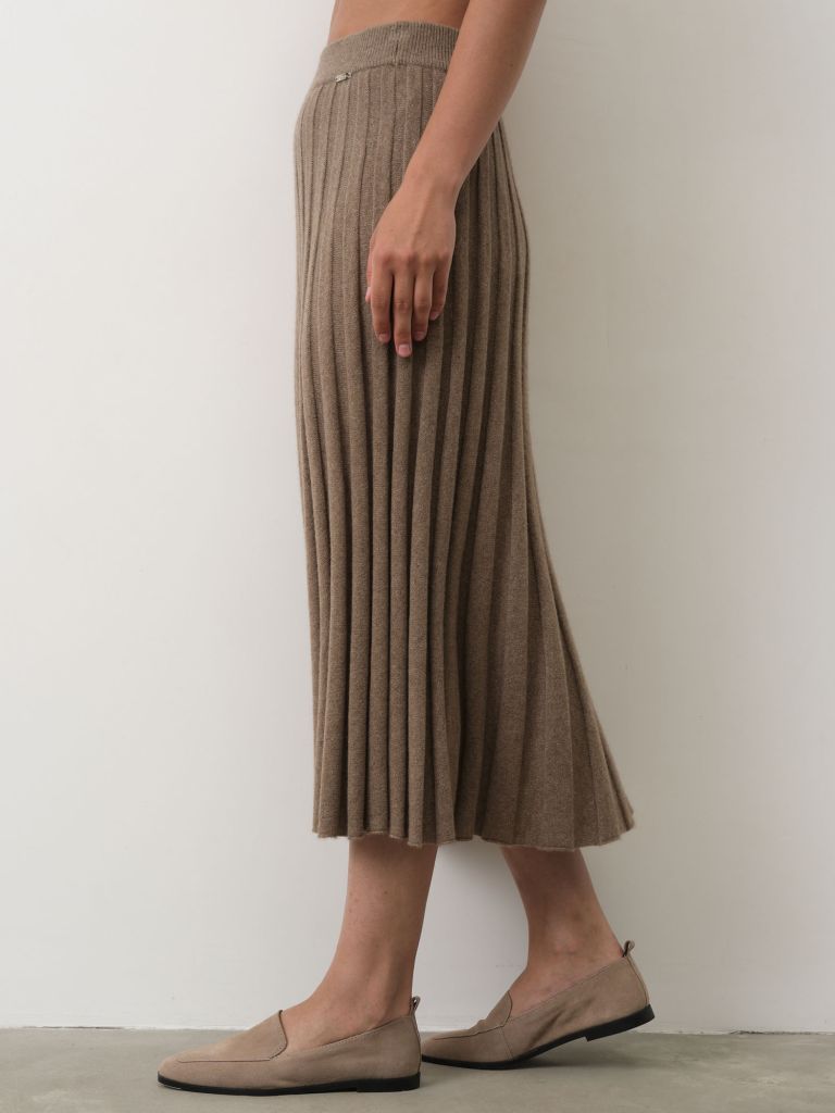 Юбка из кашемира — элегантная и женственная модель с плиссированной фактурой, которая красиво движется при ходьбе и придаёт образу лёгкость. Подходит для повседневных и более утончённых образов, легко сочетается с джемперами, водолазками и блузами.