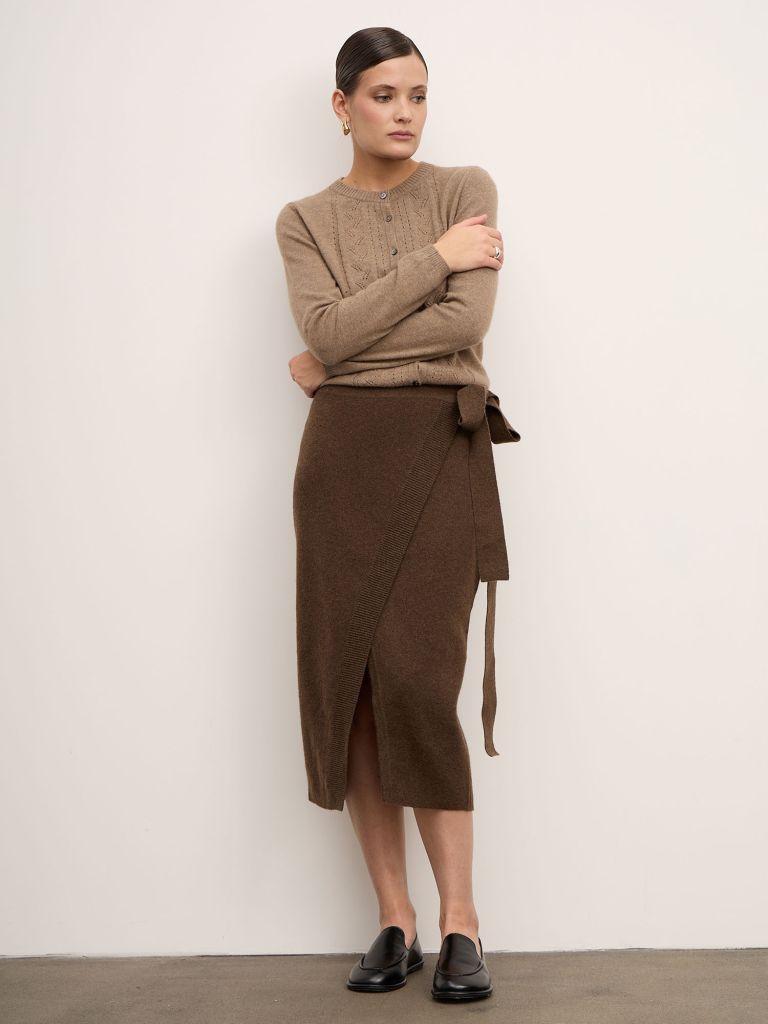 Элегантная юбка из пуха яка в коричневом цвете — идеальное решение для стильного образа в прохладное время года. Изделие отличается мягкостью и комфортом, благодаря натуральному пуху яка, который обеспечивает тепло и уют в течение всего дня. Уникальный дизайн с эффектом запаха и разрезом добавляет женственности и привлекательности, подчеркивая стройность ног. Универсальный коричневый оттенок позволяет легко сочетать юбку с различными блузками, свитерами и обувью. Эта юбка станет отличным выбором как для повседневных, так и для более нарядных образов.