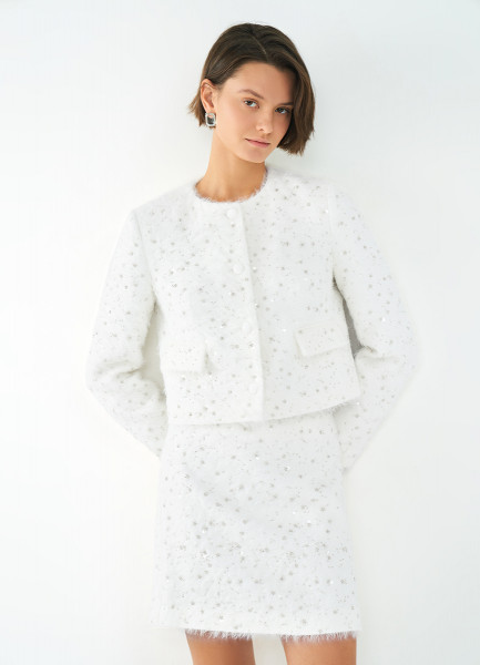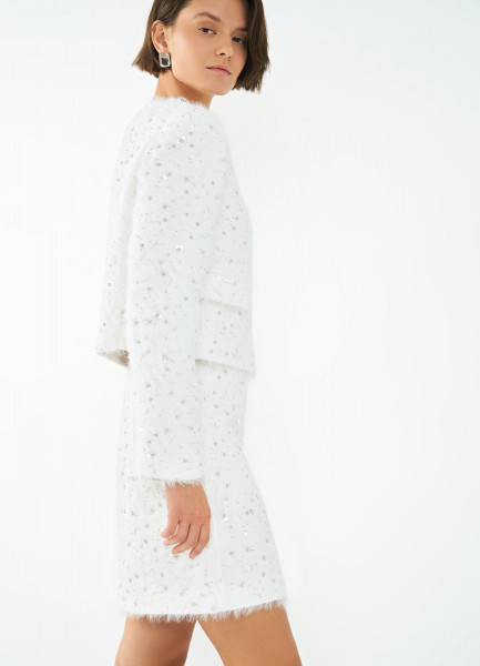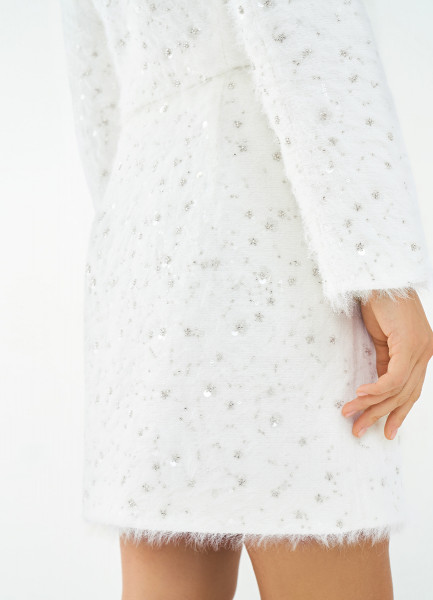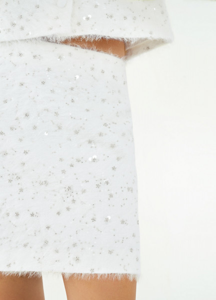 Пушистая мини-юбка из твида с пайетками и бисером, Белый