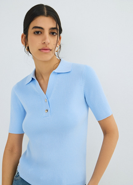 Джемпер в рубчик с воротником-поло, Голубой