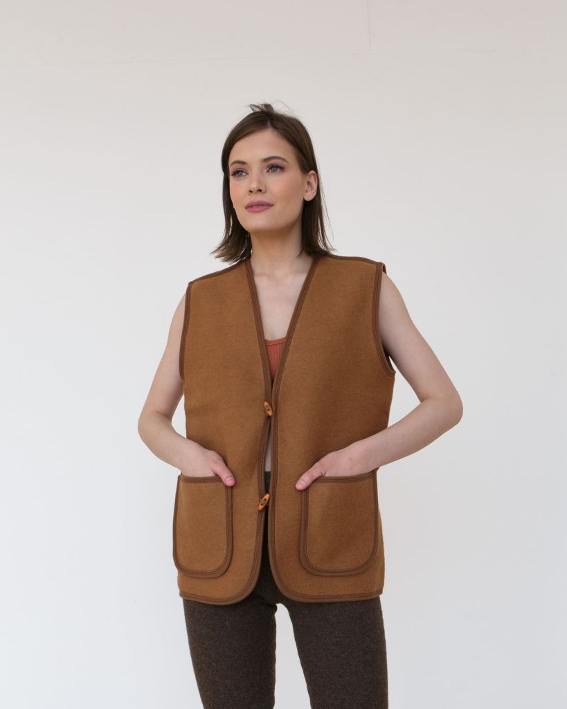 Валяная структура делает жилет плотным и устойчивым к ветру, при этом он остаётся мягким и приятным на ощупь. Такой способ обработки повышает износостойкость изделия и позволяет ему долго сохранять форму.