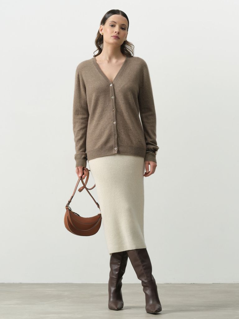 Женский кардиган из кашемира цвета капучино – это не просто элемент гардероба, а настоящий образец стиля и комфорта. Изготовленный из 100% кашемира, он предоставляет ощущения утонченной мягкости и тепла, что особенно важно в прохладные дни. Его уникальные свойства включают отличную воздухопроницаемость и гипоаллергенность, что делает его идеальным выбором для чувствительной кожи. В жару кашемир также способен поддерживать оптимальную температуру, позволяя вашей коже дышать. Элегантный V-образный вырез в сочетании с застежкой на пуговицы придает кардигану изысканный вид. Удобный крой с легким свободным силуэтом и коротким рукавом не сковывает движений, что позволяет создавать стильные образы для различных поводов. Этот жакет идеально подходит как для деловых встреч, так и для неформальных мероприятий, легко комбинируется с джинсами, юбками или брюками.Подходя для межсезонья и прохладных летних вечеров, кардиган из кашемира станет универсальным элементом вашего гардероба. Его долговечность и изысканный дизайн не оставят равнодушными ни истинных модниц, ни ценителей комфортной и стильной одежды. Присоединяйтесь к тем, кто оценивает качество и экологичность – добавьте этот кашемировый кардиган в свой гардероб и наслаждайтесь каждым днем, наполненным комфортом и элегантностью.