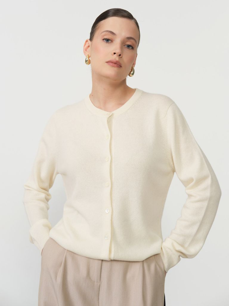 Изысканный кардиган из 100% натурального кашемира в нежном сливочном оттенке – непревзойденное сочетание роскоши и комфорта для вашего гардероба. Этот превосходный предмет одежды отличается исключительной мягкостью и неповторимым тактильным ощущением, которое может подарить только натуральный кашемир высшего качества.Природные свойства кашемирового волокна делают этот кардиган идеальным для различных погодных условий. Материал обладает превосходной теплоизоляцией, при этом остается легким и воздушным. Натуральная гипоаллергенность и способность к терморегуляции обеспечивают комфортное ношение в течение всего дня, позволяя коже дышать.Элегантный крой кардигана с классическим воротником и функциональной застежкой на пуговицы создает безупречный силуэт, подчеркивающий достоинства фигуры. Сливочный оттенок придает образу благородную нежность и утонченность, легко сочетаясь с различными цветовыми палитрами. Этот универсальный тон идеально подходит для повседневных, деловых и вечерних образов, добавляя им элегантности и свежести.Кашемировый кардиган – это долгосрочная инвестиция в качественный и стильный гардероб. При бережном уходе он сохраняет свои превосходные свойства и безупречный внешний вид на протяжении многих лет. Пополните свою коллекцию этим роскошным предметом одежды, который станет неизменным спутником в создании элегантных и комфортных образов для любого случая.