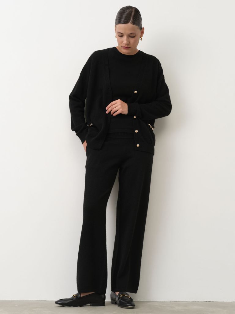 Элегантный кардиган из мягкого и тёплого пуха яка в классическом чёрном цвете — идеальное сочетание уюта и изысканности. Модель выполнена с V-образным вырезом и застёжкой на ряд стильных пуговиц с золотистым блеском. Два накладных кармана украшены деликатной декоративной цепочкой, придающей образу нотку шика. Благодаря природным свойствам пуха яка кардиган прекрасно сохраняет тепло, оставаясь при этом лёгким и дышащим. Универсальный дизайн легко впишется как в повседневные, так и в более строгие образы, сочетаясь с брюками, юбками и платьями.