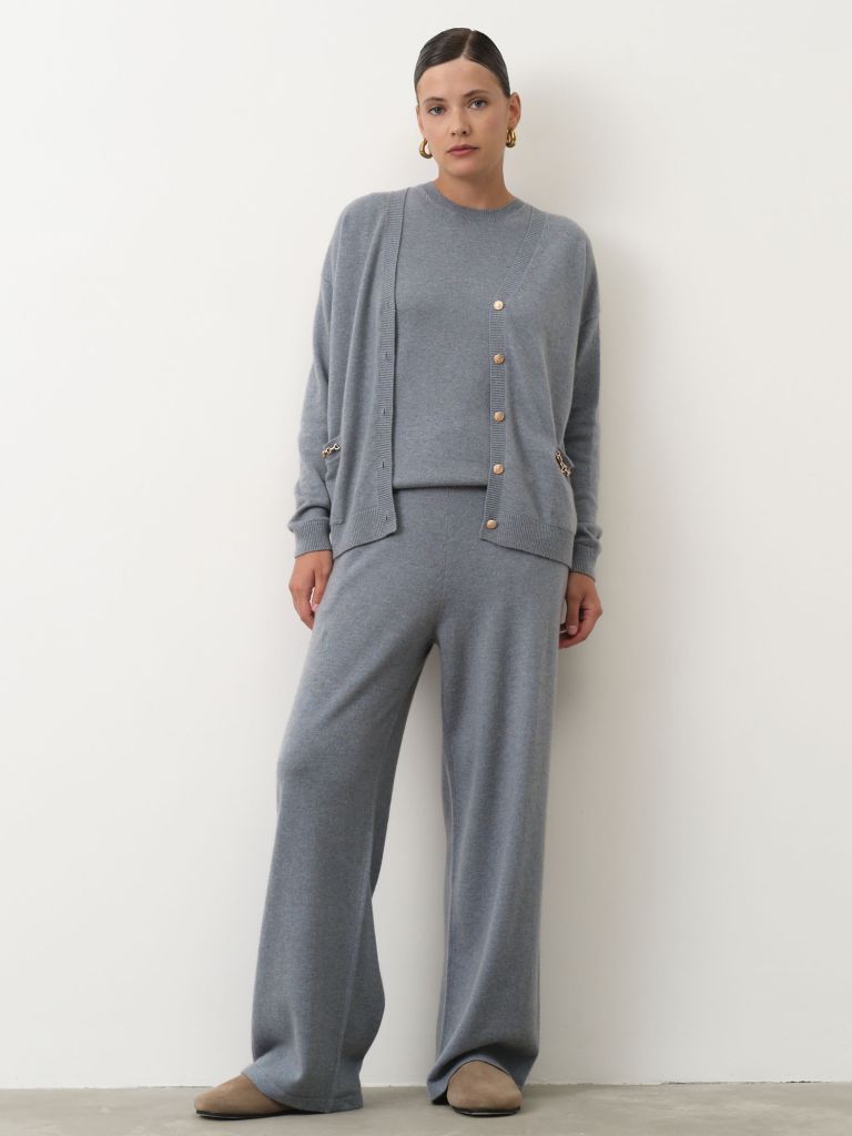 Лаконичный кашемировый джемпер без рукавов в изысканном серо-голубом оттенке — универсальная и стильная база для многослойных образов. Модель имеет прямой силуэт с аккуратной круглой горловиной и эластичными краями, что обеспечивает идеальную посадку. Мягкая фактура кашемира дарит комфорт и нежность к телу, сохраняя тепло и лёгкость. Топ прекрасно сочетается с жакетами, кардиганами или самостоятельно с брюками и юбками, создавая элегантные и современные комплекты.