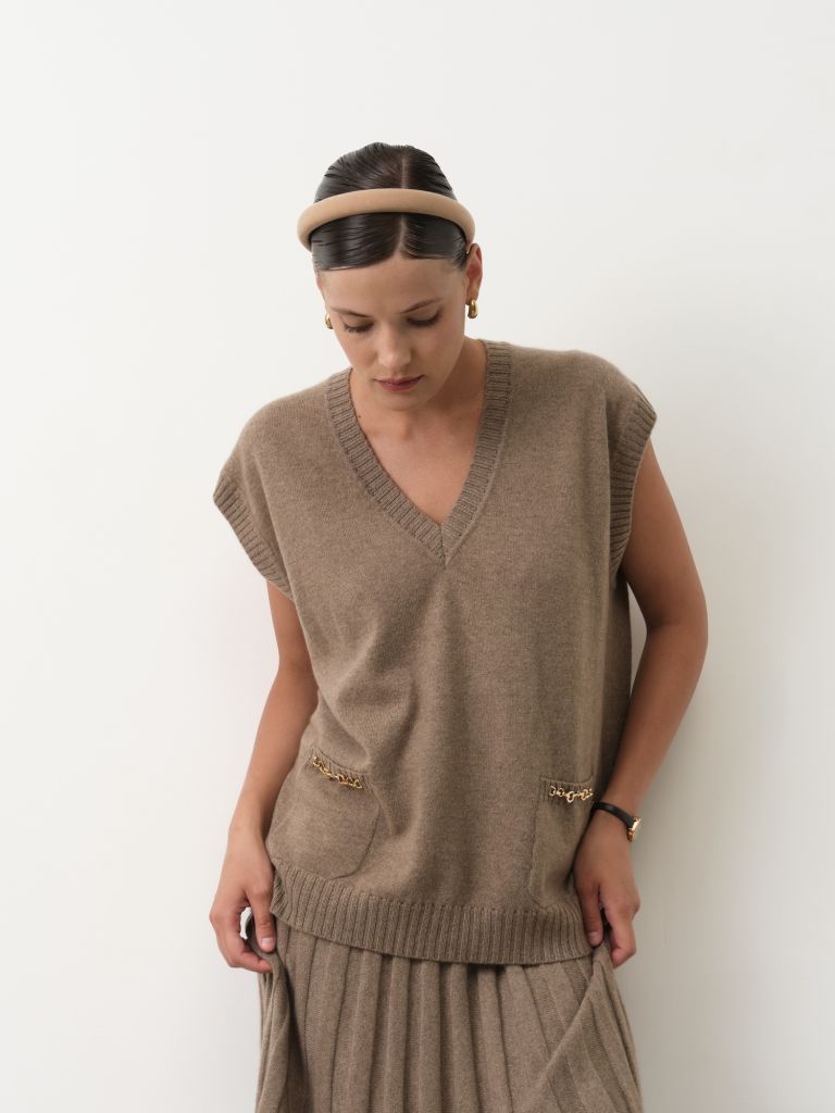 Стильный кашемировый жилет в оттенке капучино – универсальный элемент многослойных образов. Модель выполнена в свободном крое с V-образным вырезом и аккуратной резинкой по краям, что придаёт изделию современный силуэт. Два накладных кармана декорированы изящной золотистой цепочкой, добавляющей элегантный акцент. Мягкая текстура кашемира дарит ощущение уюта и тепла, а нейтральный цвет позволяет легко сочетать жилет с рубашками, водолазками, юбками или брюками, создавая стильные casual и офисные комплекты.