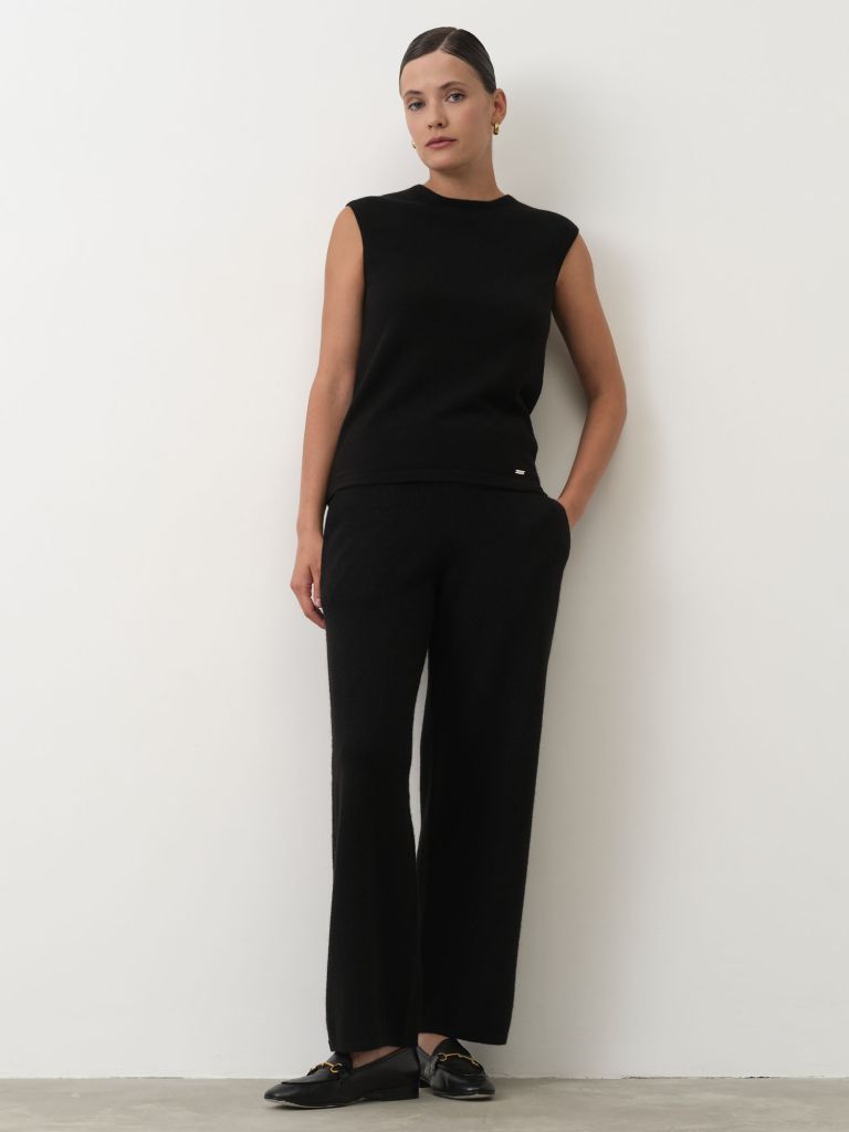 Лаконичный кашемировый джемпер без рукавов в классическом чёрном цвете — универсальная база для стильных и современных образов. Модель имеет прямой крой с аккуратной круглой горловиной и гладкой фактурой, создавая утончённый минималистичный силуэт. Мягкий кашемир обеспечивает комфорт и лёгкость, а также хорошо сохраняет тепло. Такой топ идеально подходит для многослойных комплектов с жакетами, кардиганами или самостоятельно сочетается с брюками и юбками для элегантного повседневного стиля.