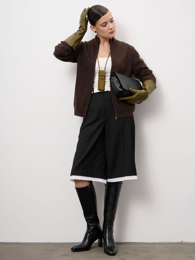 Элегантный женский кардиган из натурального пуха яка в глубоком тёмно-коричневом оттенке. Модель отличается лаконичным дизайном и благородной фактурой, подчёркивающей премиальность материала. Кардиган мягко драпируется, создавая утончённый силуэт, и легко вписывается как в повседневные, так и в более статусные образы.Материал:Пух яка — натуральное волокно с высокими теплоизоляционными свойствами. Он заметно теплее овечьей шерсти, при этом легче и мягче на ощупь, отлично сохраняет тепло и обеспечивает комфорт в прохладную погоду.Крой и посадка:Прямой, свободный крой без утяжеления фигуры. Кардиган удобно носить как в застёгнутом, так и в распахнутом виде, сочетая с юбками, брюками или платьями.Детали:Минималистичное исполнение, аккуратная обработка краёв, универсальная длина. Глубокий тёмно-коричневый цвет подчёркивает текстуру пуха яка и легко комбинируется с базовыми оттенками гардероба.Сезонность:Осень, зима, прохладная весна.Уход:Рекомендуется бережная ручная стирка в прохладной воде с использованием специальных средств для изделий из пуха и шерсти. Сушить в разложенном виде, избегая скручивания и воздействия прямых источников тепла. Готовую памятку по уходу вы можете прочитать у нас в блоге.