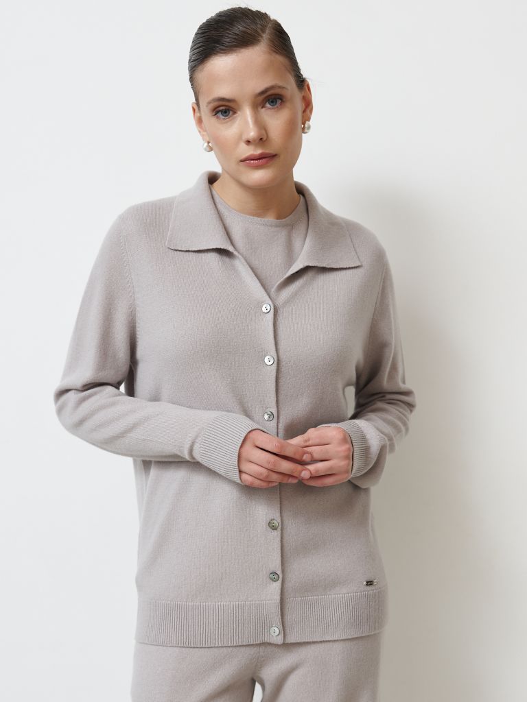 Кардиган выполнен из мягкого натурального кашемира, отличается лаконичным дизайном и универсальным оттенком «лунный». Модель подходит как для повседневных, так и для более элегантных образов, легко комбинируется с базовым гардеробом.