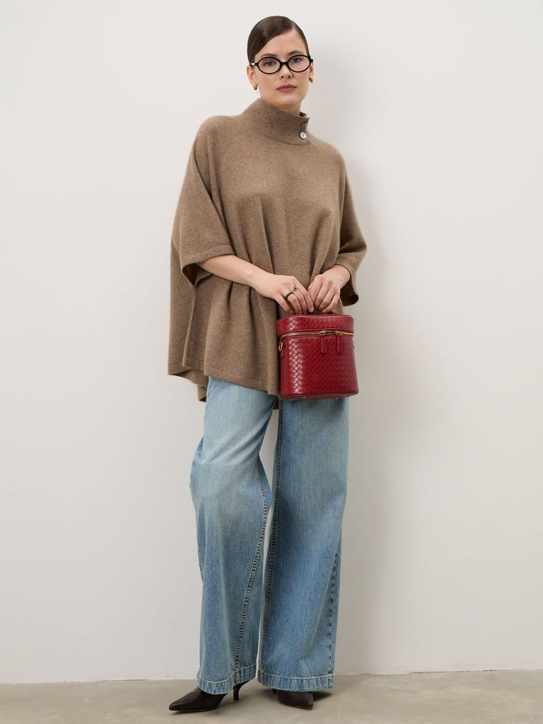 Пончо легко становится частью многослойного гардероба. Носите его поверх водолазок, рубашек или тонкого трикотажа. Хорошо сочетается с джинсами, брюками или юбками. В светлой гамме образ получается мягким и цельным, с тёмным низом — более контрастным и собранным.