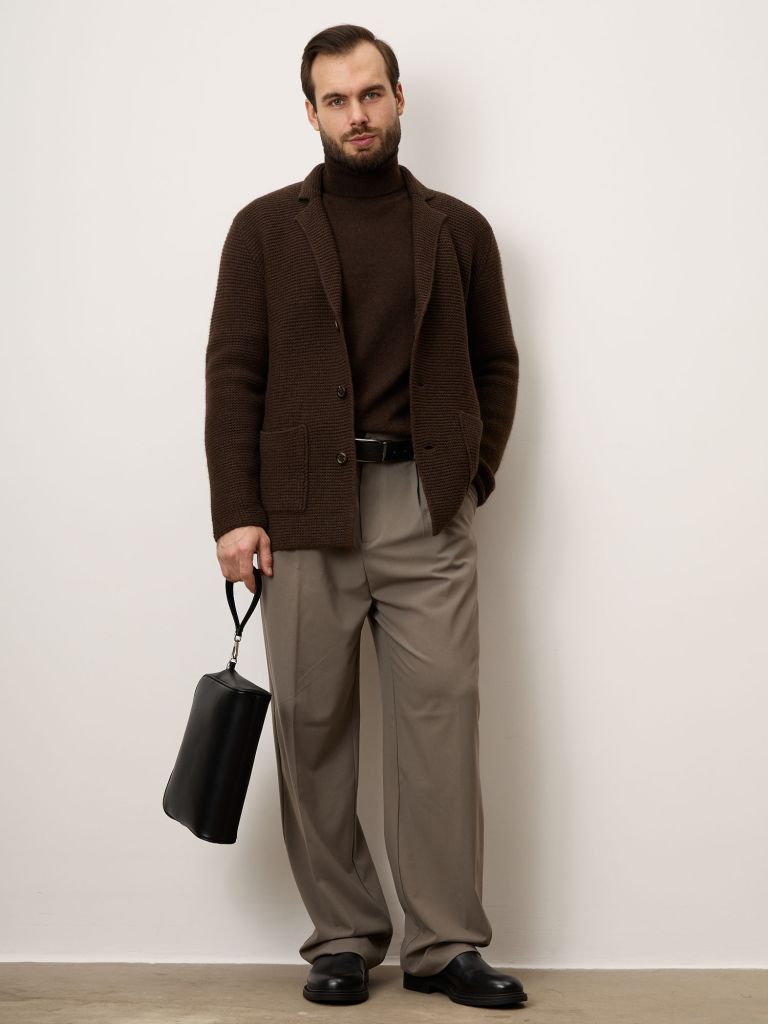 Мужской кардиган из пуха яка в глубоком темно-коричневом оттенке — сочетание элегантности, практичности и натурального тепла. Модель выполнена в классическом стиле с лаконичным силуэтом, что делает её универсальной основой гардероба. Благородный цвет легко комбинируется с базовыми оттенками и подчеркивает статусный, сдержанный образ.Материал:Изготовлен из натурального пуха яка — ценного природного волокна, известного своей мягкостью, прочностью и высокой теплоизоляцией. Материал отлично сохраняет тепло, оставаясь лёгким и комфортным в носке. Подходит для прохладной погоды и межсезонья.Крой и детали:Кардиган прямого силуэта с аккуратным отложным воротником и застёжкой на пуговицы. Фактурная вязка придаёт изделию выразительность и глубину. Накладные карманы добавляют практичности и завершённости дизайну.Посадка и комфорт:Свободная, комфортная посадка не сковывает движений и позволяет носить кардиган как поверх водолазки или рубашки, так и самостоятельно. Подходит для деловых и повседневных образов.Уход:Рекомендуется бережная ручная стирка в прохладной воде или профессиональная химчистка. Сушить в разложенном виде, избегая растягивания и воздействия прямых источников тепла.Готовую памятку по уходу вы можете прочитать у нас в блоге.