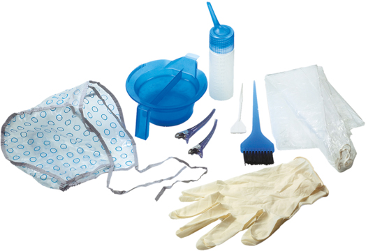 Набор для окрашивания волос T-1218K2 включает в себя 9 предметов: шапочка, перчатки, пелерина, миска, апликатор, кисточка, 2 зажима, лопаточка для краски + крючок.