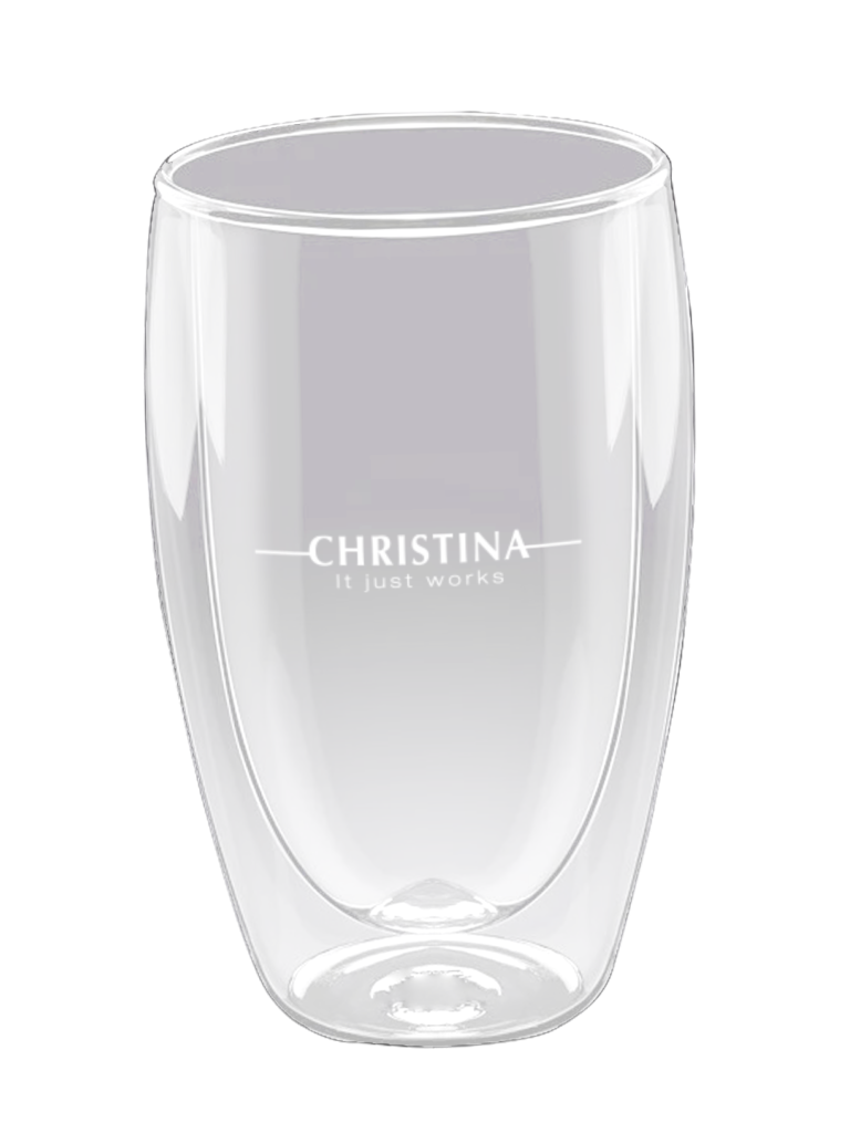 Соблюдение питьевого режима – полезная привычка, которая помогает сохранить здоровье и молодость. Стакан Christina имеет специфическую конструкцию – две стенки и вакуумное пространство между ними, что позволяет ему долго держать температуру напитка – будь то прохладная вода или горячий чай. Он станет украшением в интерьере и еще одним напоминанием о любимой косметике Christina. Материал – стекло. Размер – 450 мл.