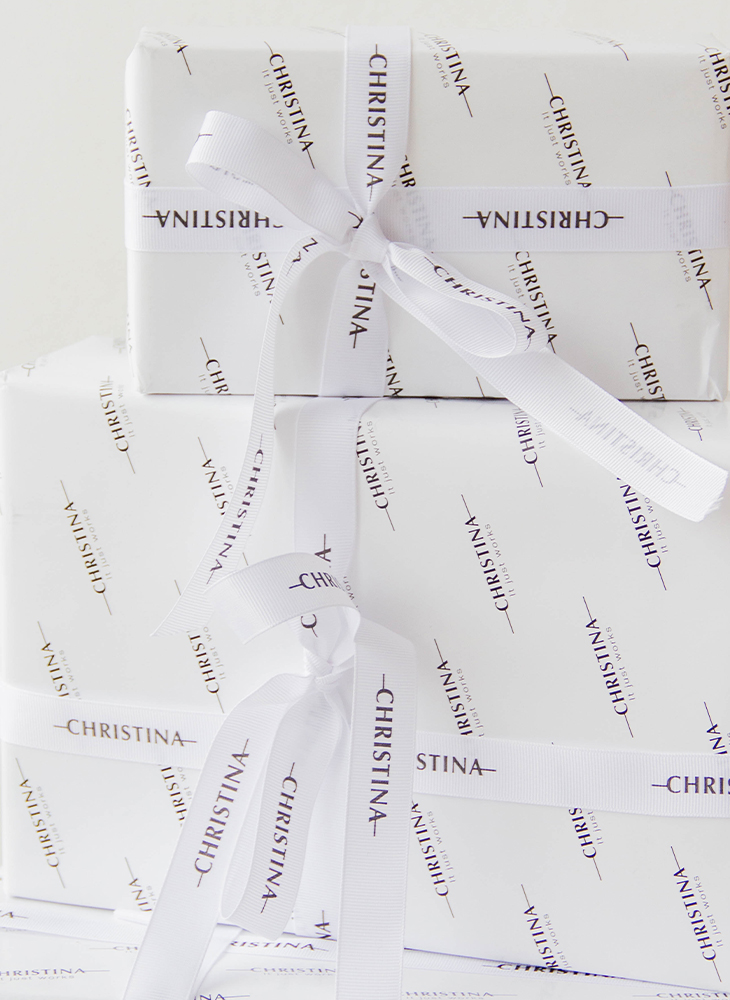 Если вы дарите косметику Christina, не забудьте про упаковочную бумагу и ленту в стилистике бренда. Такой презент сразу создаст праздничное настроение, ведь в процессе распаковки всегда есть нечто волшебное. Дизайн ленты Christina лаконичен: на основе белого цвета расположен повторяющийся логотип. Материал – репс, ширина – 19 мм, длина ленты – 10м.