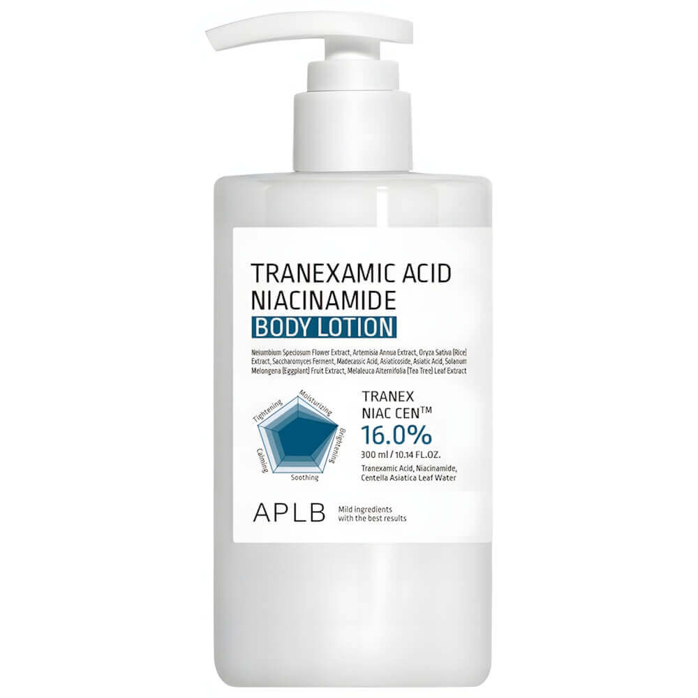 Лосьон для тела с транексамовой кислотой APLB Tranexamic Acid Niacinamide Body Lotion интенсивно увлажняет, устраняет сухость и шелушение, смягчает огрубевшие участки. Восстанавливает гидролипидный баланс, снижает чувствительность кожи, укрепляет защитный барьер. Содержит транексамовую кислоту, ниацинамид, гидролат центеллы, сахаромицеты, экстракты лотоса и риса, коллаген.