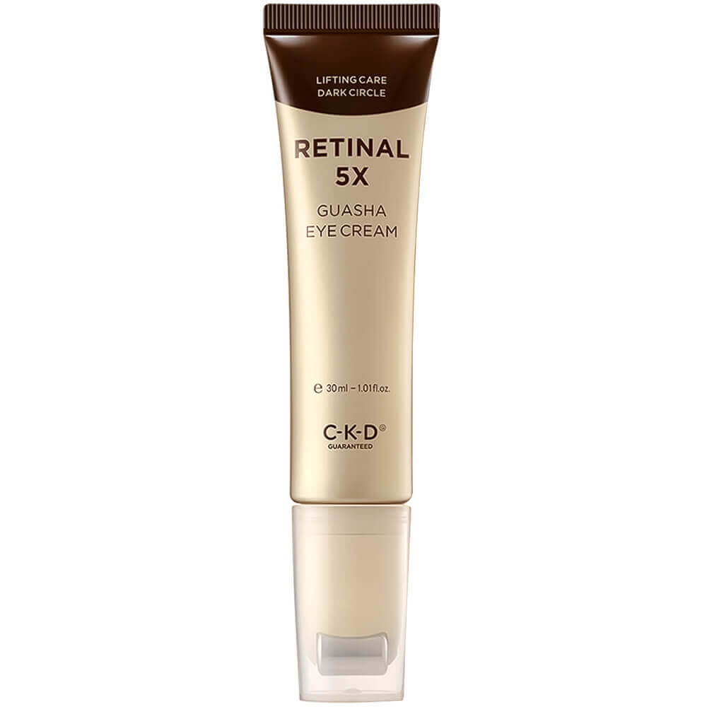 Омолаживающий крем для век с роликовым массажёром CKD Retinal 5X Guasha Eye Cream подтягивает тонкую кожу век, сокращает глубину морщин, избавляет от отёчности и тёмных кругов. Средство с лифтинг-эффектом действует не только за счёт состава, но и благодаря роллеру, которым можно массировать периорбитальную зону. Крем содержит ретиналь, волюфилин, ПДРН, глутатион, кофеин, коллаген и эластин, а также 6 растительных масел.