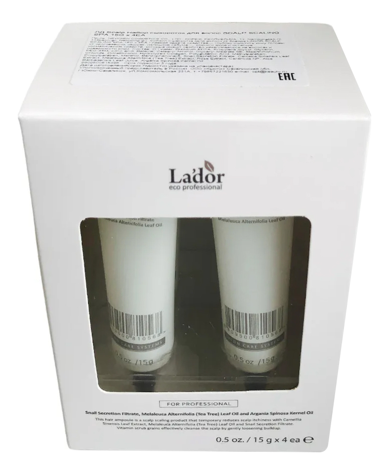 От производителя:Непременным условием сохранения красоты и здоровья волос является регулярное удаление загрязнений и омертвевших клеток кожи. Испытать на себе эффект салонной процедуры поможет новое средство корейского бренда La`dor. Пилинг для волос Scalp Scaling Spa Ample эффективно и бережно очищает кожу головы и волосы, экстракт улитки и протеины шелка придают волосам мягкость и блеск. Ментол приятно освежает и успокаивает кожу.Способ применения:Небольшое количество пилинга Scalp Scaling Spa Ample от La`dor нанести на чистые влажные волосы и кожу головы, помассировать 3-5 минут, смыть водой.Состав:D.I water, Disodium EDTA, Propylene Glycol, Glycerin, PEG-45M, citric acid, Betaine, Cetearyl Alcohol, Glyceryl Stearate SE, Steartrimonium Chloride Dimethiconol, Hydrolyzed Collagen, Polyglutamic Acid, Methylparaben, Propylparaben, Menthol, Benzophenone-5, Snail Secretion Filtrate, Camellia Sinensis Leaf Extract, Melaleuca Alternifolia (Tea Tree) Extract, Rose Extract, Ceramide NP, Aloe Barbadensis Leaf Juice, ArganiaSpinosa Kernel Oil, Cyclomethicone, Dimethiconol,Mineral Oil, CI 15985, Perfume.