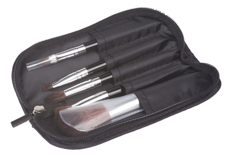Набор мини-кистей для макияжа в чехле C-709 немецкой марки Dewal включает 5 профессиональных компактных предметов: 2 кисти для нанесения теней, 1 для губ, 1 для использования румян и ещё 1 кисть для коррекции бровей и создания подводки контура глаз. Комплект находится в чёрном чехле из прочного полимерного материала, его удобно носить с собой, так как он помещается в любую маленькую дамскую сумочку. В любом месте в любое время вы легко можете подправить макияж или создать его заново. Все ручки кистей набора выполнены из дерева, имеют прочный, мягкий и эластичный искусственный ворс, который набирает нужное количество косметического продукта и медленно отдаёт его. Все предметы легко моются, быстро сохнут, не осыпаются, сохраняют свою функциональность и отличный внешний вид в течение всего срока службы. Комплект надёжен и долговечен, безопасен и удобен в использовании. Размер чехла: 15 x 5,5 см.