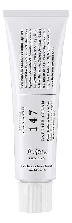 Состав:Крем для лица с церамидами Dr. Althea Pro Lab 147 Barrier Cream имеет следующий состав: Water, Glycerin, Dipropylene Glycol, Cetearyl Alcohol, Caprylic/Capric Triglyceride, Methyl Trimethicone, Hydrogenated Polydecene, 1,2-Hexanediol, Phenyl Trimethicone, Vegetable Oil, Dimethicone/Vinyl Dimethicone Crosspolymer, Glyceryl Strarate SE, Coptis Japonica Root Extract, Artemisia Princeps Leaf Extract, Persea Gratissima (Avocado) Fruit Extract, Brassica Oleracea Acephala Leaf Extract, Hydrolyzed Gardenia Florida Extract, Paeonia Albiflora Flower Extract, Hydrogenated Lecthin, Sodium Hyaluronate, Cetearyl Olivate, Palmitic Acid, Sorbitan Olivate, C12-16 Alcohols, Behenyl Alcohol, Stearic Acid, Microcrystalline Cellulose, Cetearyl Glucoside, Butylene Glycol, Ethylhexylglycerin, Ammonium Acryloyldimethyltaurate/VP Copolymer, Polyglyceryl-10 Myristate, Glyceryl Polymethacrylate, Cellulose Gum, Cholesterol, Ceramide NP, Disodium EDTA, Glyceryl Stearate, Methylpropanediol, Maltodextrin, Guaiazulene, Ceramide AS, Ceramide AP, Arginine, Carbomer, Ceramide NS, Ceramide NG, Tocopherol, Dimethylsilanol Hyaluronate, Hydrolyzed Sodium Hyaluronate, Hydrolyzed Hyaluronic Acid, Potassium Hyaluronate, Hyaluronic Acid, Sodium Hyaluronate Crosspolymer, Hydroxypropyitrimonium Hyaluronate, Sodium Hyaluronate Dimetbyslarol, Sodium Acetylated Hyaluronate, Ceramide EOP.