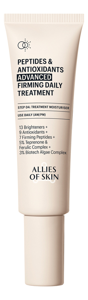 Allies of Skin Усиленный укрепляющий пептидный крем для лица с антиоксидантами Peptides & Antioxidants Advanced Firming Daily Treatment — это увлажняющий крем с усовершенствованной формулой 5 в 1. Отлично подходит для утреннего и вечернего применения. Он объединяет в себе пять основных преимуществ, которые необходимы вашей коже, в одном флаконе: увлажнение, укрепление, очищение, защиту от свободных радикалов и осветление.