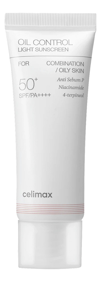 От производителя:Легкий солнцезащитный крем Oil control light sunscreen Spf50+ Pa++++ с функцией контроля жирности создан специалистами Celimax для ухода за жирной и комбинированной кожей лица. Средство обеспечивает эффективную защиту от негативного влияния солнечного излучения, абсорбирует излишки себума, регулирует работу сальных желез и матирует покровы.Средство содержит комплекс мощных SPF-фильтров, а также натуральные растительные экстракты, ниацинамид и гиалуроновую кислоту. С помощью этих компонентов крем смягчает и успокаивает кожу, снижает ее реактивность при контакте с агрессивными внешними факторами, увлажняет и противостоит появлению солнечных ожогов.Способ применения:После основного ухода нанести необходимое количество средства на открытые участки кожи, распределить до полного впитывания. Обновлять по мере необходимости в течение дня. Состав:Солнцезащитный легкий крем с контролем жирности Oil control light sunscreen Spf50+ Pa++++ от Celimax содержит Purified Water, *Jinxoxide, Dibutyl Adipate, Cyclohexasiloxane, Dipropylene Glycol, Dicapryl Carbonate, Propylheptyl Caprylate, Butyloctyl Salicylate, Cetyldiglyceryltris (Trimethylsiloxy)Silylethyldymethicone, Niacinamide, Caprylmethicone, Methylmethacrylate Cross Polymer, *Diethylaminohydroxybenzoylhexylbenzoate, *Bis-Ethylhexyloxyphenolmethoxyphenyltriazine, *Ethylhexyltriazone, Calcium Aluminum Borosilicate, Polyglyceryl-3 Polydimethylsiloxyethyldimetikone, Polymethylsilesquioxein, Evening Primrose Flower Extract, Sugar Elm Root Extract, Great Pine Leaf Extract, Arrowroot Extract, Sodium Hyaluronate, *Titanium Dioxide, Diasteadaimonium Hextorite, Magnesium Sulfate, Triethoxycaprylylsilane, 1,2-Hexanediol, Phenyl Trimethicone, Acrylate/Dimethicone Copolymer, Polyglyceryl-6 Polysinolyate, Glyceryl Caprylate, Caprylyl Glycol, Ethylhexylglycerin, Adenosine, 4-Turpineol, Silica, Tocopherol.
