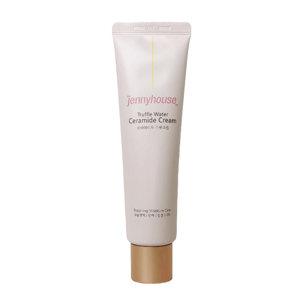 Увлажняющий крем для упругости кожи с чёрным трюфелем JennyHouse Truffle Water Ceramide Cream направлен на укрепление барьерных функций, восстанавливает повреждённую липидную мантию и нормализует водно-жировой баланс. Способствует уплотнению кожи, повышает эластичность тканей и разглаживает кожные заломы. Содержит церамиды, пептид аргирелин, аденозин и фермент грибка Aureobasidium Pullulans.