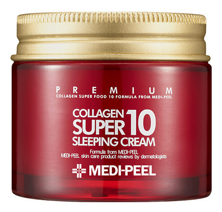 От производителя:Medi-Peel Ночной крем для лица с коллагеном Collagen Super10 Sleeping Cream обеспечивает комплексный уход за кожей, укрепляя и разглаживая ее структуру, а также предотвращая потерю влаги. Основной активный компонент крема — гидролизованный коллаген с низкой молекулярной массой, что способствует его легкому проникновению в кожу, восстанавливая дефицит собственного коллагена. Этот процесс поощряет регенерацию, разглаживание морщин и укрепление контуров лица. Коллаген эффективно предотвращает обезвоживание кожи. Встроенный в состав крема пептидный комплекс стимулирует фибробласты к производству коллагена 1 и 2 типов, улучшая текстуру кожи. Помимо эффекта лифтинга, этот комплекс помогает предотвращать появление морщин, расслабляя мышцы лица.Способ применения:Нанесите немного крема на чистую, тонизированную кожу лица, распределите. Используйте крем для вечернего ухода.Состав:Water, Glycerin, Niacinamide, Dimethicone, Fiji -240 / E.Diicopolymer Bismuth-decyl Tetradeceth-20 Ether, Butylene Glycol, Oat Powder Extract, Dimethicone / Vinyl Dimethicone Cross Polymer, Hydroxy Acetophenone, Fiji-10 Dimethicone, Glyceryl Stearate, Low Sweet Blueberry Extract, Garlic Extract, Sweet Almond Oil, Squalane, Spinach Extract, Tomato Fruit / Leave / Stem Extract, Wine Extract, Blood Easy-60 Hydrogenated Castor Oil, Hydrolyzed Collagen, Walnut Extract, Propane Diol, Fiji-100 Stearate, Al-Han, Carbomer, Ethyl Hexyl Glycerin, Allantoin, Trehalose, Flavoring, Adenosine Disodium dithiate, sodium hyaluronate, green tea extract, argan kernel oil, jojoba seed oil, Lamide N-Py, Hydrogenated Lecithin, Aloe Vera Leaf Extract, Dipropylene Glycol, Glyceres-20, Bioflavonoid, Fiji-10 Grape Seed Sterol, 1,2-hexanediol, Olive Tree Leaf Extract, Spain Licorice Root Extract, Western Dandelion Leaf Extract, Broccoli Extract, Oregano Leaf Extract, Cypress Leaf Extract, White Willow Bark Extract, Lactobacillus / Ball Ferment Extract, Purslane Extract, Broiler Bark Extract, Golden Wine Extract, Damask Rose Flower Extract, Rock Stone Root Extract, Ussonia Extract, Cedar Fruit Extract Halmiflower Extract, Acetyl Hexapeptide-8, Copper Tripeptide-1, Oligopeptide-29, Oligopeptide-32, Palmitoyl Pentapeptide-4.