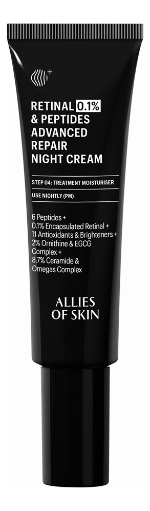 От производителя:Усиленный пептидный крем Retinal 0,1% & Peptides Advanced Repair Night Cream от косметического бренда Allies of Skin обогащен ретиналем и предназначена для восстанавливающего ухода за лицом. Средство нацелено на интенсивное омоложение и рассчитано на особенности сухой и нормальной, зрелой и увядающей кожи.