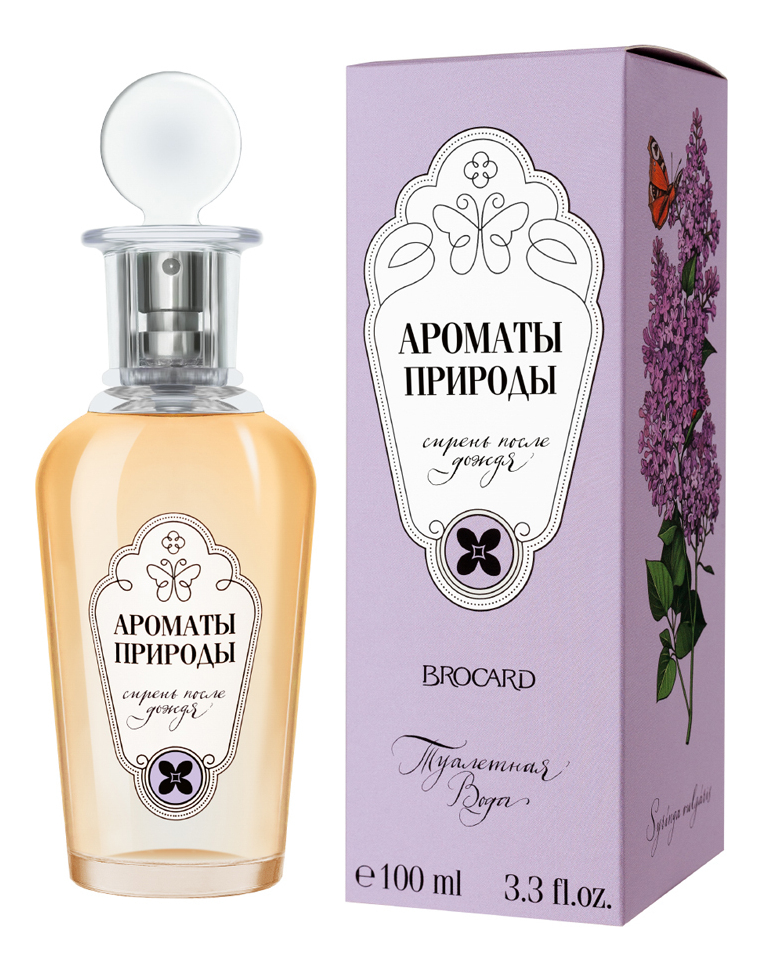 Яркая коллекция Brocard «Ароматы природы» в 2021 году пополнилась ароматом Сирень после дождя. Адресованная женщинам композиция создана парфюмером Мари-Каролин Симар. Объединив ноты сирени, садовых цветов, меда и ванили, мастер сотворила волшебную иллюзию теплого майского дня. Прошедший ливень очистил и освежил воздух, россыпью алмазных капель украсил молодую зелень и наполнил мир чарующим благоуханием. Композиция заключена во флакон, дизайн которого напоминает аптечные склянки начала прошлого века. Знакомство с ароматом начинается с нот бергамота, майского ландыша и цветущего миндаля. Сердце образовано великолепными аккордами, сирени, розы и жасмина. Особую притягательную сладость запаху Brocard Ароматы природы Сирень после дождя придают оттенки меда, ванили и цветов гелиотропа.