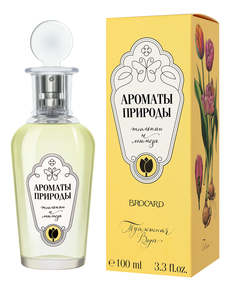 Аромат Tulpan I Mimoza выпущен российским парфюмерным брендом Brocard в рамках парфюмерной коллекции Fruttissimo. Парфюм посвящен прекрасному женскому дню 8 Марта, сочетает в себе два неповторимых запаха: тюльпана и мимозы, которые олицетворяют весну и женственность. Композиция представлена в концентрации туалетной воды, обладает легким, свежим, окрыляющим звучанием, обволакивает нежностью, излучает позитив и солнечный свет.Начало звучания удивляет изысканным сочетанием черного чая, танжерина и банановых листьев. Истинная женственность и гармония кроется в изящном сердце, где филигранно соединены самобытные цветочные тона тюльпана, мимозы и орхидеи. Аромат, как истинный бриллиант, подан в драгоценной оправе, сочетающей искушающие тона мускуса и экзотические нотки кокосового молока.
