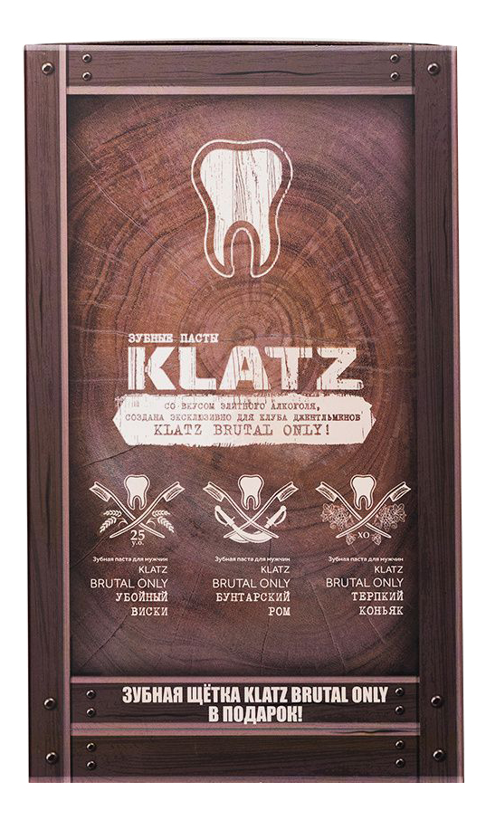 От производителя: Набор для ухода за зубами Brutal Only от российского косметического бренда Klatz предназначен для ухода за зубами сильной половины человечества. Он бережно очищает эмаль, предотвращает появление кариеса и служит профилактикой многих стоматологических заболеваний. Кроме того он обеспечивает эффективное восстановление естественного белого цвета зубов за счет удаления зубного налета, который появляется при курении, употреблении кофе, чая и красного вина. В набор входят:Зубная паста Терпкий коньяк — обеспечивает антибактериальное и освежающее действие, бережное отбеливание зубов, профилактику образования зубного налёта. Паста со вкусом хорошего коньяка содержит отбеливающие компоненты, которые эффективно устраняют зубной налёт, создаваемый курением, употреблением кофе и красного вина. При этом эмаль не повреждается: поверхность зубов аккуратно полируется. Происходит укрепление эмали за счет входящих в состав пасты ионов фтора. А под влиянием экстракта солодки исчезают бактерии. Благодаря присутствию в продукте активных солей предотвращается появление зубного налёта снова. Зубная паста Убойный виски — это укрепление эмали, профилактика кариеса, эффективное отбеливание и освежающий эффект! Терпкий вкус хорошего виски создает приятные ощущения. Входящий в состав отбеливающего комплекса растительный папаин расщепляет белки зубного налёта. При этом эмаль не травмируется, а поверхность зубов полируется. Одновременно происходит реминерализация — мельчайшие трещинки «цементируются» особым комплексом минералов. Образование зубного камня предотвращается с помощью активных солей. Дыхание освежается содержащимися в пасте экстрактами мяты и солодки.Зубная паста Бунтарский ром — содержит отбеливающий комплекс на основе растительного фермента папаина, который безопасно расщепляет белковую основу пищевого налета и обеспечивает мягкую полировку эмали. Активные соли и растительные компоненты предупреждают образование зубного камня, обеспечивают реминерализацию зубной эмали и заполняют микротрещинки. А эфирное масло имбиря способствует эффективному уничтожению бактерий, господствующих в ротовой полости. Вкус хорошего рома приятно порадует любого мужчину.Жесткая зубная щетка Brutal Only — обеспечивает качественную и эффективную гигиену полости рта. Щетина изготовлена из высококачественного немецкого нейлона Pedex и предназначена для ежедневного ухода за зубами и деснами. Щетка имеет закругленную щетину, тщательно отполированную по немецкой технологии. Это обеспечивает максимально эффективное чистящее действие. Легкая, удобная и эргономичная ручка изделия позволяет очистить самые труднодоступные места, без дополнительного надавливания. Способ применения:Набор Klatz Brutal Only предназначен для регулярного ухода за зубами и ротовой полостью. Состав:Зубная паста Терпкий коньяк: Water, Hydrated Silica, Glycerin, Sorbitol, Hydroxyapatite, Xanthan Gum, Sodium Lauryl Sulfate, Aroma, Sodium Lauroyl Sarcosinate, Zinc Lactate, Papain, Allantoin, Titanium Dioxide, Sodium Saccharin, Olea Europaea (Olive) Oil, Menthol, Sodium Benzoate, Potassium Sorbate.Зубная паста Убойный виски: Water, Hydrated Silica, Glycerin, Sorbitol, Hydroxyapatite, Xanthan Gum, Sodium Lauryl Sulfate, Aroma, Sodium Lauroyl Sarcosinate, Zinc Lactate, Papain, Allantoin, Titanium Dioxide, Sodium Saccharin, Olea Europaea (Olive) Oil, Menthol, Sodium Benzoate, Potassium Sorbate.Зубная паста Бунтарский ром: Water, Hydrated Silica, Glycerin, Sorbitol, Hydroxyapatite, Xanthan Gum, Sodium Lauryl Sulfate, Aroma, Sodium Lauroyl Sarcosinate, Zinc Lactate,