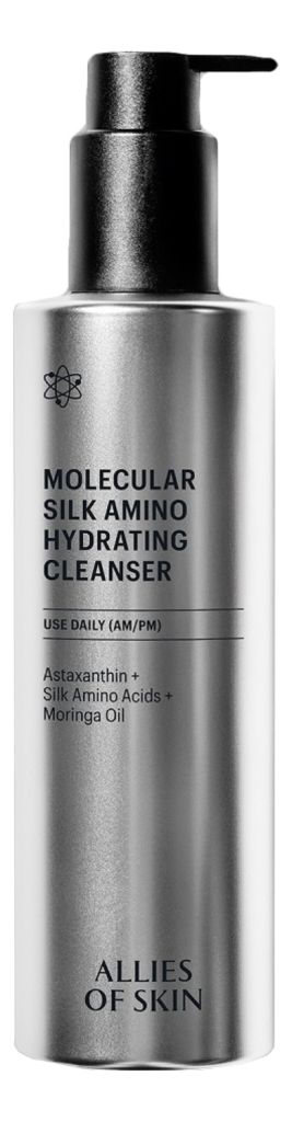 Allies of Skin Очищающий увлажняющий гель-пенка для лица с аминокислотами шелка Molecular Silk Amino Hydrating Cleanser содержит: Aqua (Water), Polyacrylate-1 Crosspolymer, Glycerin, Sodium C14-16 Olefin Sulfonate, Cocamidopropyl Hydroxysultaine, Propanediol, Coco-Caprylate/Caprate, Carthamus Tinctorius Seed Oil, Sodium Cocoamphoacetate, Helianthus Annuus Seed Oil, Leuconostoc/Radish Root Ferment Filtrate, Lactic Acid, Glyceryl Ricinoleate, Zeolite, Moringa Oleifera Seed Oil, 3-O-Ethyl Ascorbic Acid, Sodium Hyaluronate, Hydrolyzed Silk, Cocodimonium Hydroxypropyl Silk Amino Acids, Camellia Sinensis Leaf Extract, Tocopherol, Lecithin, Astaxanthin, Hydrolyzed Jojoba Esters, Tropolone, Caprylyl Glycol, Ethylhexylglycerin, Xanthan Gum, Lauryl Glucoside, Sodium Gluconate, Sodium Cocoyl Glutamate, Sodium Lauryl Glucose Carboxylate, Polysorbate 20, 1,2-Hexanediol, Disodium EDTA, Sodium Hydroxide, Citric Acid, Sodium Benzoate, Phenoxyethanol.