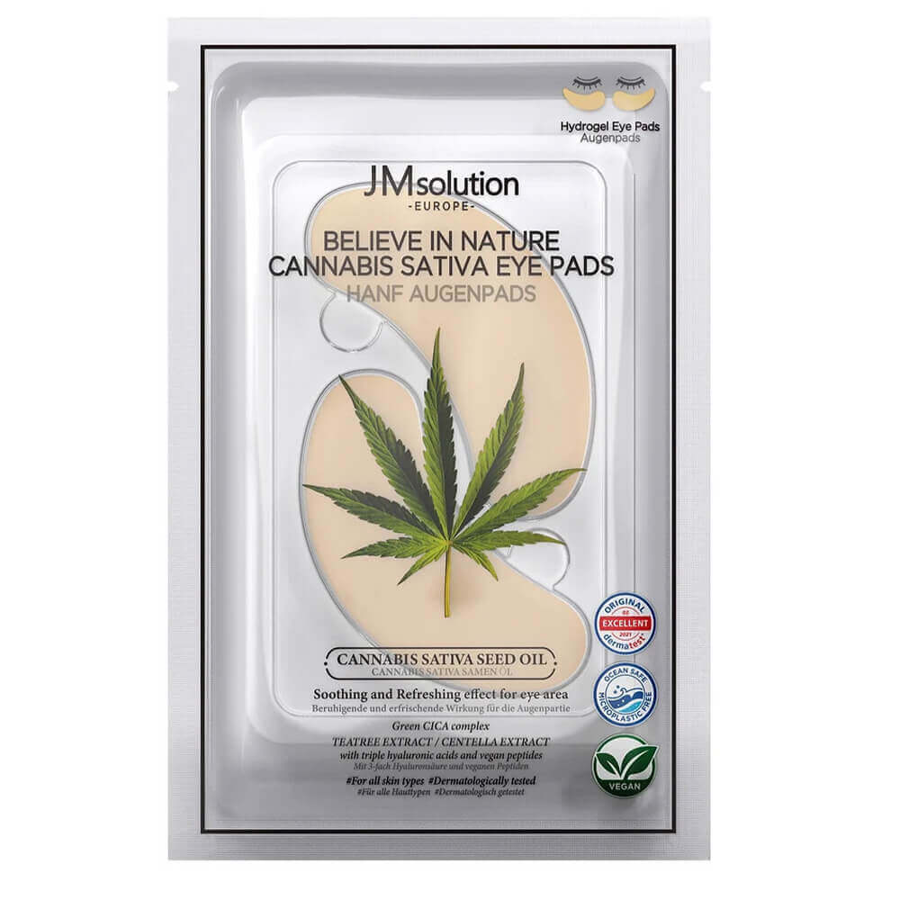 Охлаждающие патчи от отёков с коноплёй JMsolution Europe Believe In Nature Cannabis Sativa Eye Pads снимают раздражение, увлажняют и питают нежную кожу вокруг глаз, придавая приятное ощущение прохлады. Патчи повышают эластичность и упругость, устраняют сухость и ощущение стянутости. 100% веганский состав содержит масло конопли, комплекс Green CICA, экстракты чайного дерева и хауттюйнии, растительные протеины.