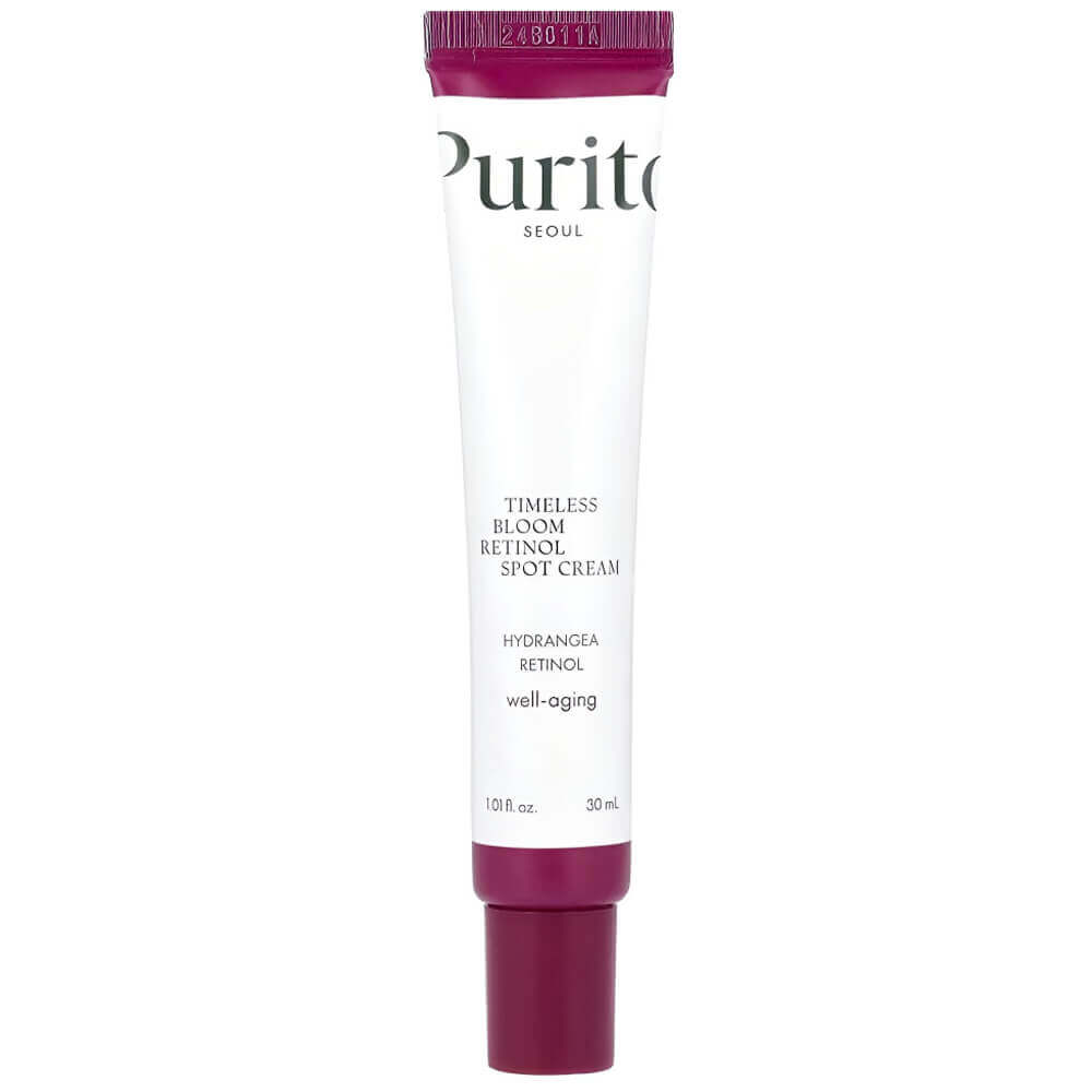 Локальный крем с ретинолом и бакучиолом Purito Seoul Timeless Bloom Retinol Spot Cream разглаживает мимические морщины и предотвращает их появление, способствует осветлению гиперпигментации и постакне. Продукт можно использовать в качестве крема для век, в зоне межбровья и носогубных складок. Содержит гиалуроновую кислоту, экстракты гортензии, зелёного чая и чеснока.