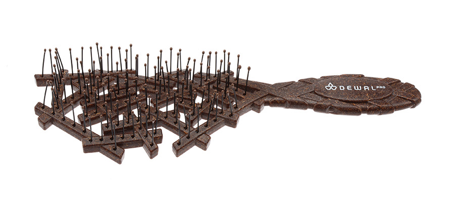 Форма щетки похожа на гнездо из веток. Хаотично расположенные ламели прочно крепятся между собой, создавая гибкую продувную конструкцию. Эргономичный дизайн идеально повторяет форму головы. Упругая, мягкая щетина обладает высокой эластичностью и отлично массирует кожу.