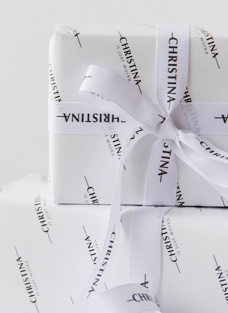 Если вы дарите косметику Christina, не забудьте про упаковочную бумагу и ленту в стилистике бренда. Такой презент сразу создаст праздничное настроение, ведь в процессе распаковки всегда есть нечто волшебное. Дизайн ленты Christina лаконичен: на основе белого цвета расположен повторяющийся логотип.