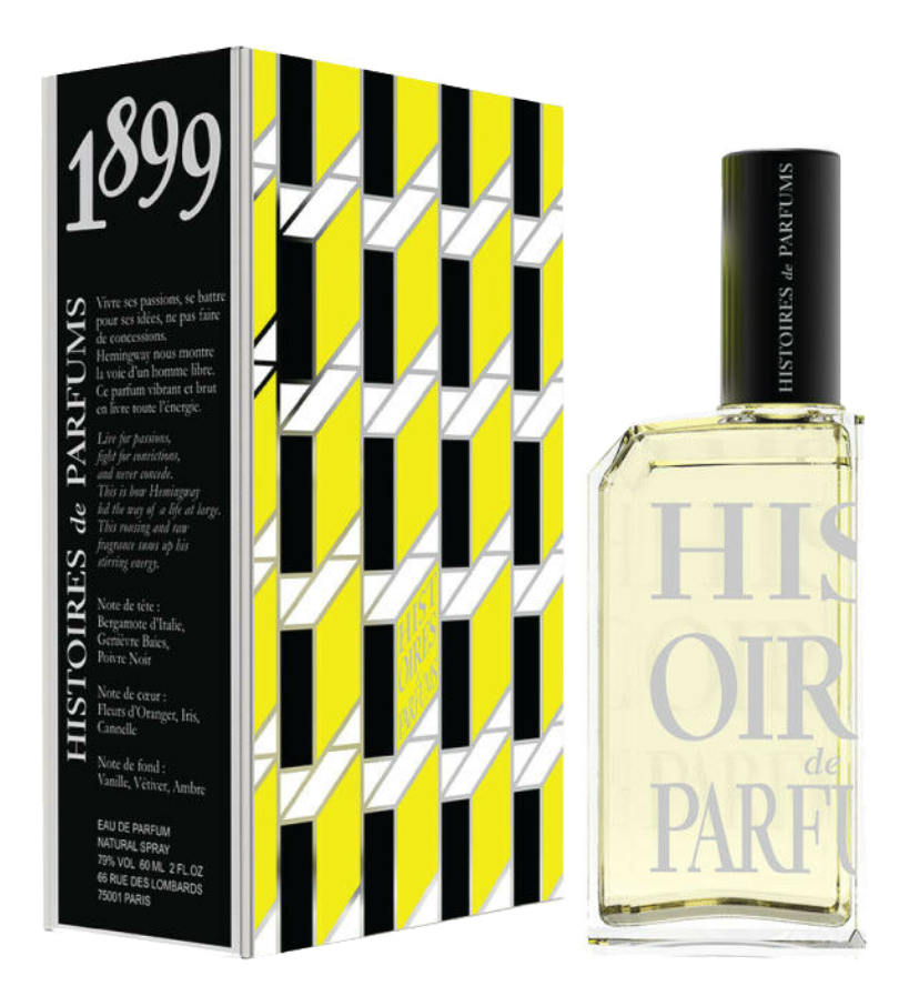 Аромат Histoires de Parfums 1899 Hemingway («Хистуар де Парфюмс 1899 Хемингуэй») был выпущен в 2013 году. Автором композиции стал парфюмер Gerald Ghislain. Аромат для мужчин и женщин принадлежит к семейству восточных пряных. Яркий, мощный и взрывной, этот аромат переливается всеми оттенками своего букета, раскрывая в себе ноты экзотических пряностей, свежесть цитрусовых и пудровую томность амбры. Стильный флакон простой формы украшен крупными буквами и металлической крышкой. Похожий по самобытности и элегантности аромат-унисекс - Le Labo Moscow Benjoin 19.Histoires de Parfums 1899 Hemingway – это композиция из нот бергамота, можжевельника и черного перца в окружении нюансов апельсинового цвета, ириса и корицы, ванили, ветивера и амбры.